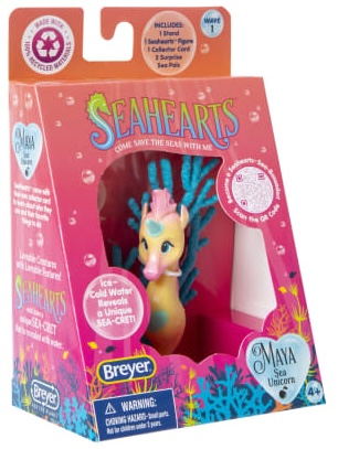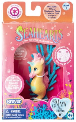 Seahearts are 3 1/4" to 4" high and made of a sturdier plastic than the lightweight ABS plastic used on Stablemates. Each model comes with 2 surprise Sea Pals and a trading card. They also have secret marks on the belly and on the right cheek near the eye when placed in cold water. The mark near the eye is the same symbol found on the trading card. Both the coral and the Seaheart have a Copyright 2023 Breyer Logo with the VIN number on the coral.