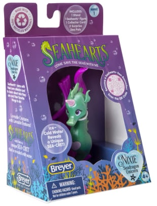 Models are packaged with a strong twisted paper tie that folds around and tucks under at the back. 'Wave 1' is the original set of Seahearts models and were available from Five Below stores and website late summer of 2023. Available on the Breyer website starting 2024.
