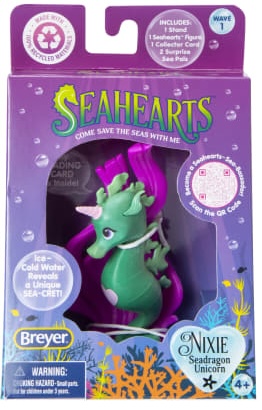 Seahearts are 3 1/4" to 4" high and made of a sturdier plastic than the lightweight ABS plastic used on Stablemates. Each model comes with 2 surprise Sea Pals and a trading card. They also have secret marks on the belly and on the right cheek near the eye when placed in cold water. The mark near the eye is the same symbol found on the trading card. Both the coral and the Seaheart have a Copyright 2023 Breyer Logo with the VIN number on the coral.