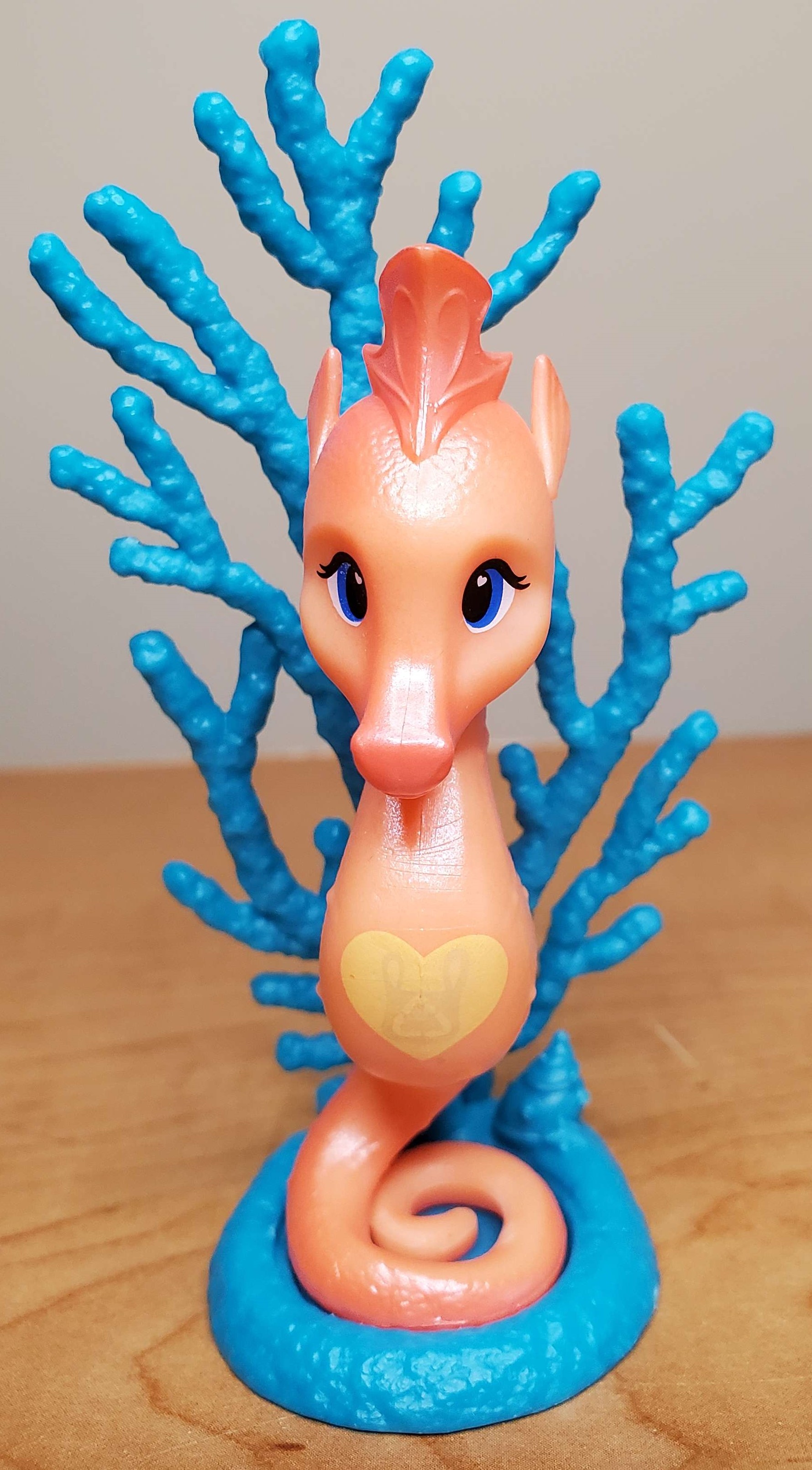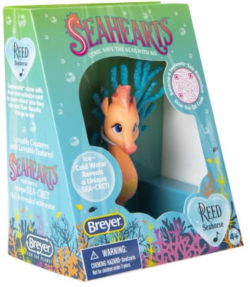 Seahearts are 3 1/4" to 4" high and made of a sturdier plastic than the lightweight ABS plastic used on Stablemates. Each model comes with 2 surprise Sea Pals and a trading card. They also have secret marks on the belly and on the right cheek near the eye when placed in cold water. The mark near the eye is the same symbol found on the trading card. Both the coral and the Seaheart have a Copyright 2023 Breyer Logo with the VIN number on the coral.