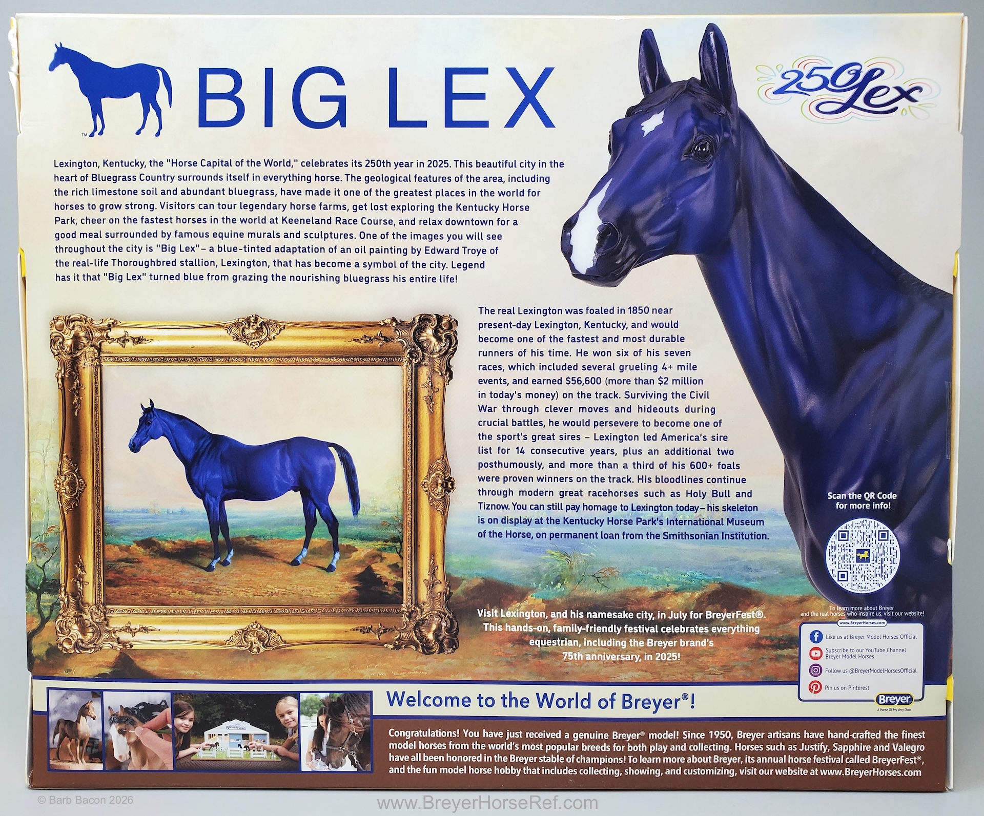 "Lexington, Kentucky, the 'Horse Capital of the World' and home of BreyerFest, celebrates its 250th year in 2025. This beautiful city in the heart of Bluegrass Country surrounds itself in everything horse! One of the images you will see throughout the city is 'Big Lex' – a blue-tinted adaptation of an oil painting by Edward Troye of the real-life Thoroughbred stallion, Lexington, that has become a symbol of the city. Legend has it that 'Big Lex' turned blue from grazing the nourishing bluegrass his entire life!