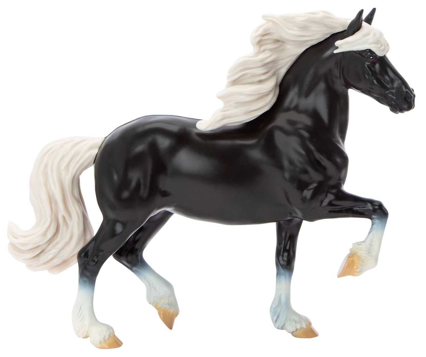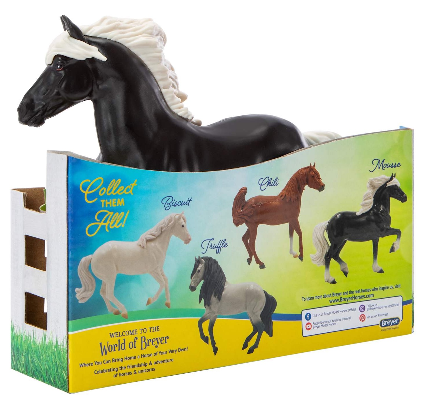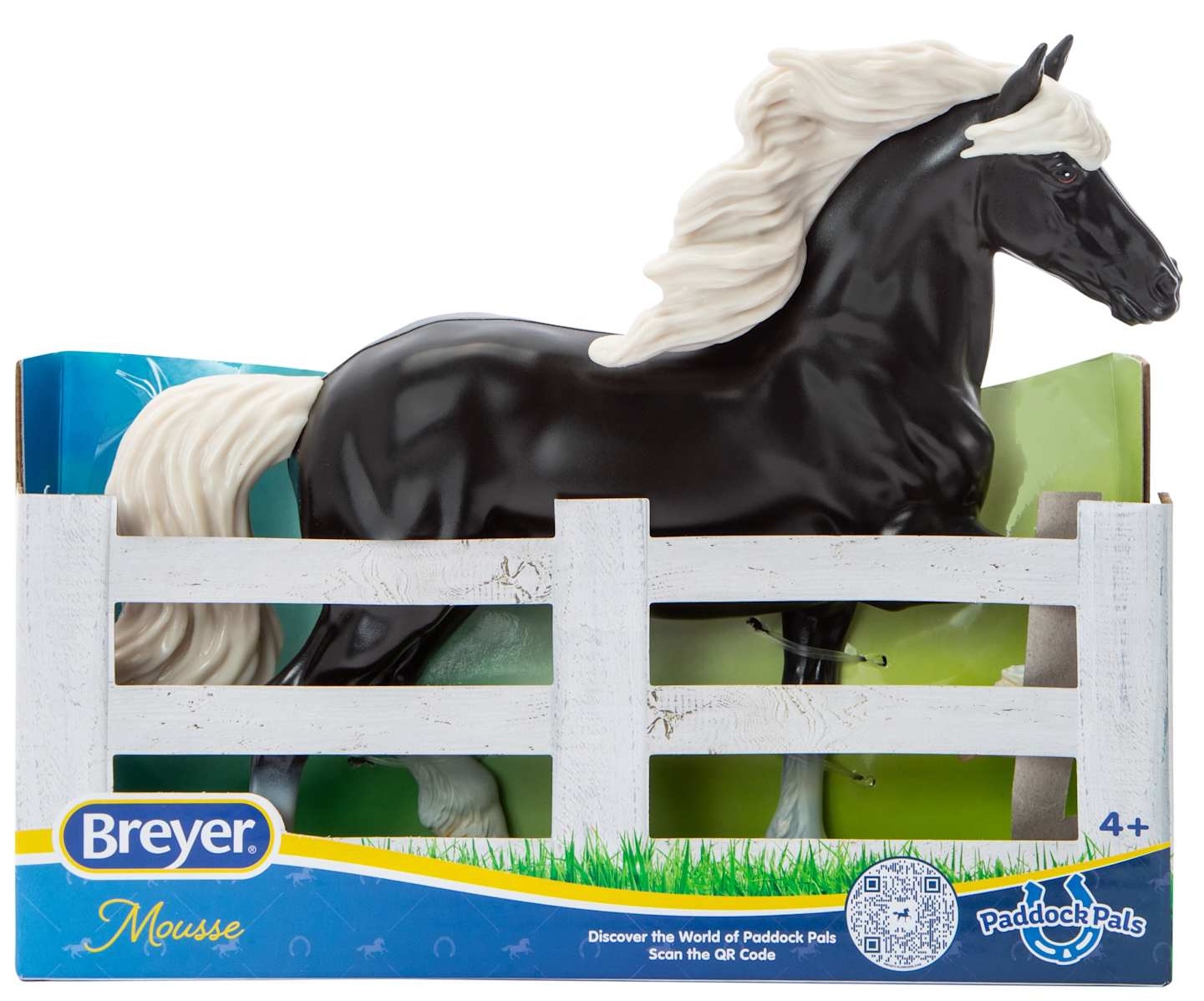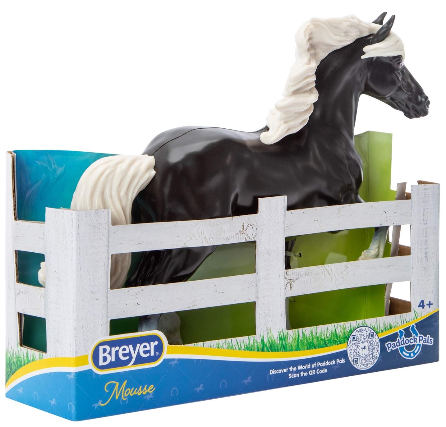 "Meet MOUSSE - Proud, beautiful Mousse pulls and races carts like a champion, and he’s got the ribbons to prove it! The Pals call him 'Vanner', an old word for a horse pulling a caraVAN! Kids love his cart rides too, and giggle when this majestic Vanner horse makes sweet little snuffly sounds!" www.paddockpals.breyerkids.com