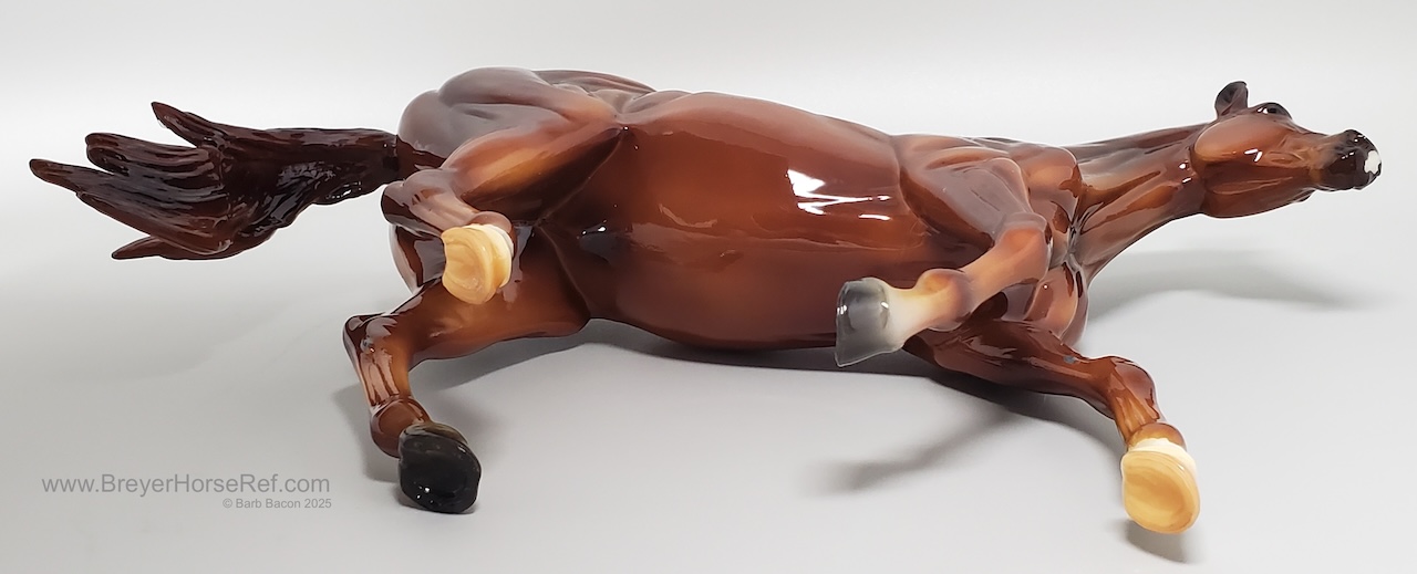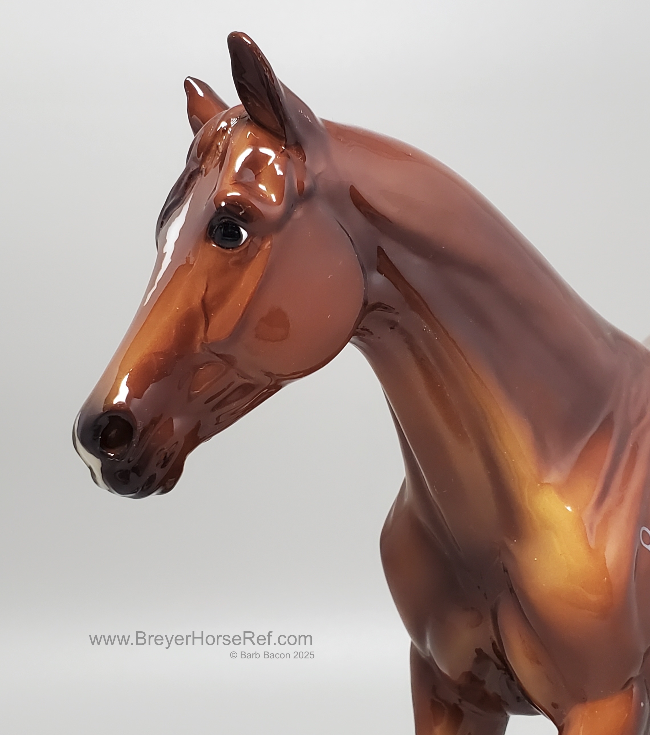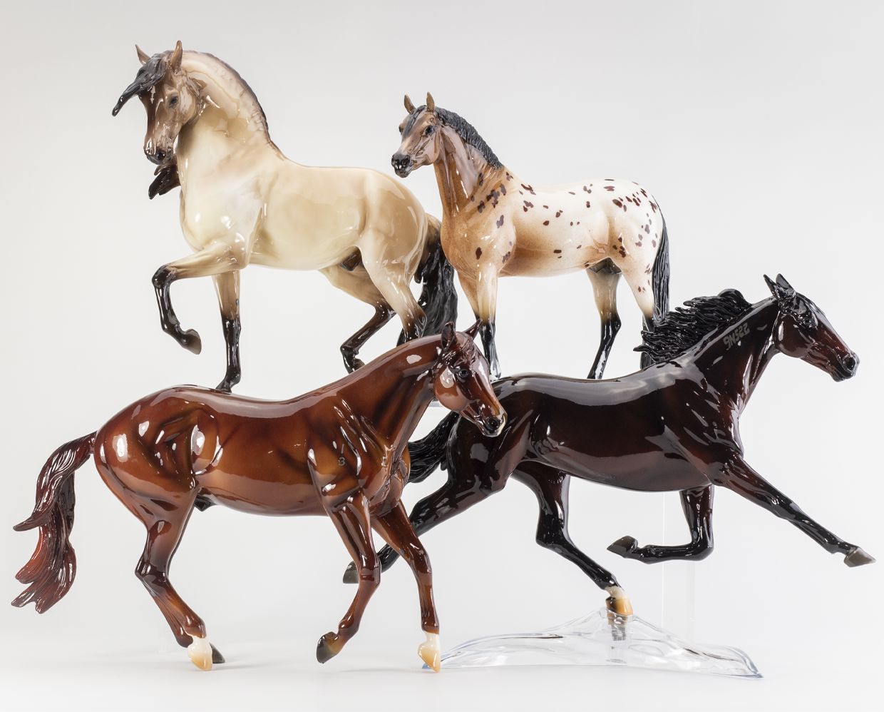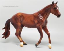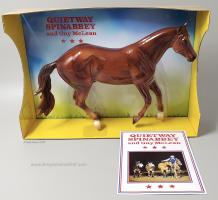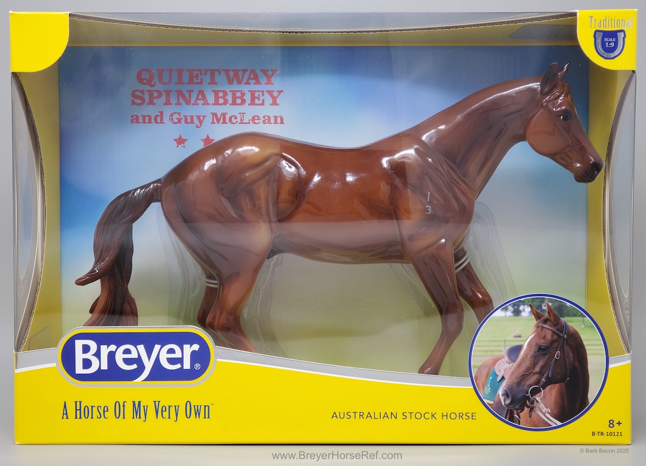 "If you’re a fan of famed Australian horseman Guy McLean, then the name Quietway Spinabbey (#B-TR-10121) may ring a bell. According to Guy, from his very first few days on earth, Spinabbey moved more like a gazelle than a foal – he spent more time with all four feet off the ground than he did with them on it! Now one of the lead horses in his live performances, Spinabbey can perform incredible maneuvers such as sideways gallops and backwards canters. His model has been produced with a custom roached mane – Spinabbey’s signature style – and includes a copy of Guy’s heartfelt keepsake poem entitled “My Mr. Incredible Quietway Spinabbey.” We're looking forward to welcoming Spinabbey to BreyerFest this year as part of Guy's team!" www.breyerhorses.com.