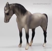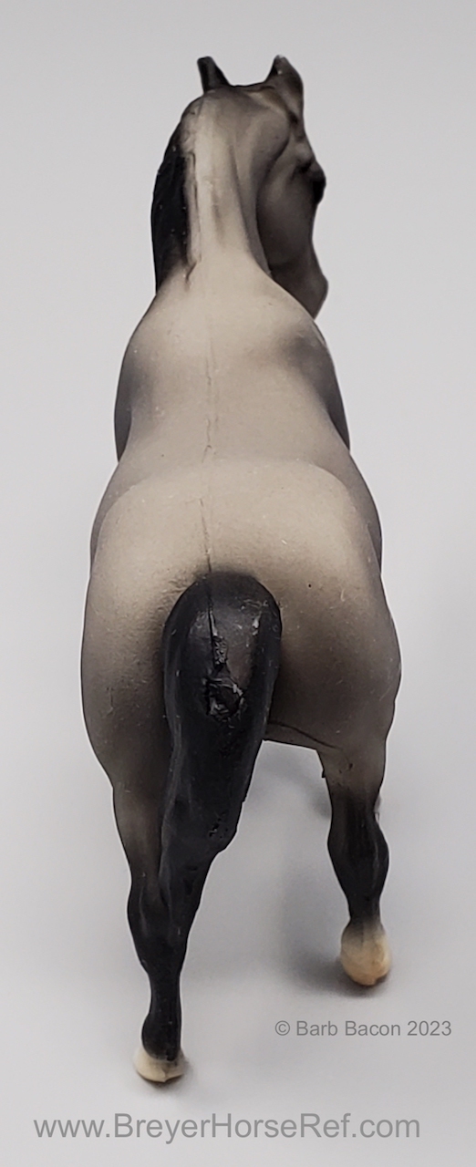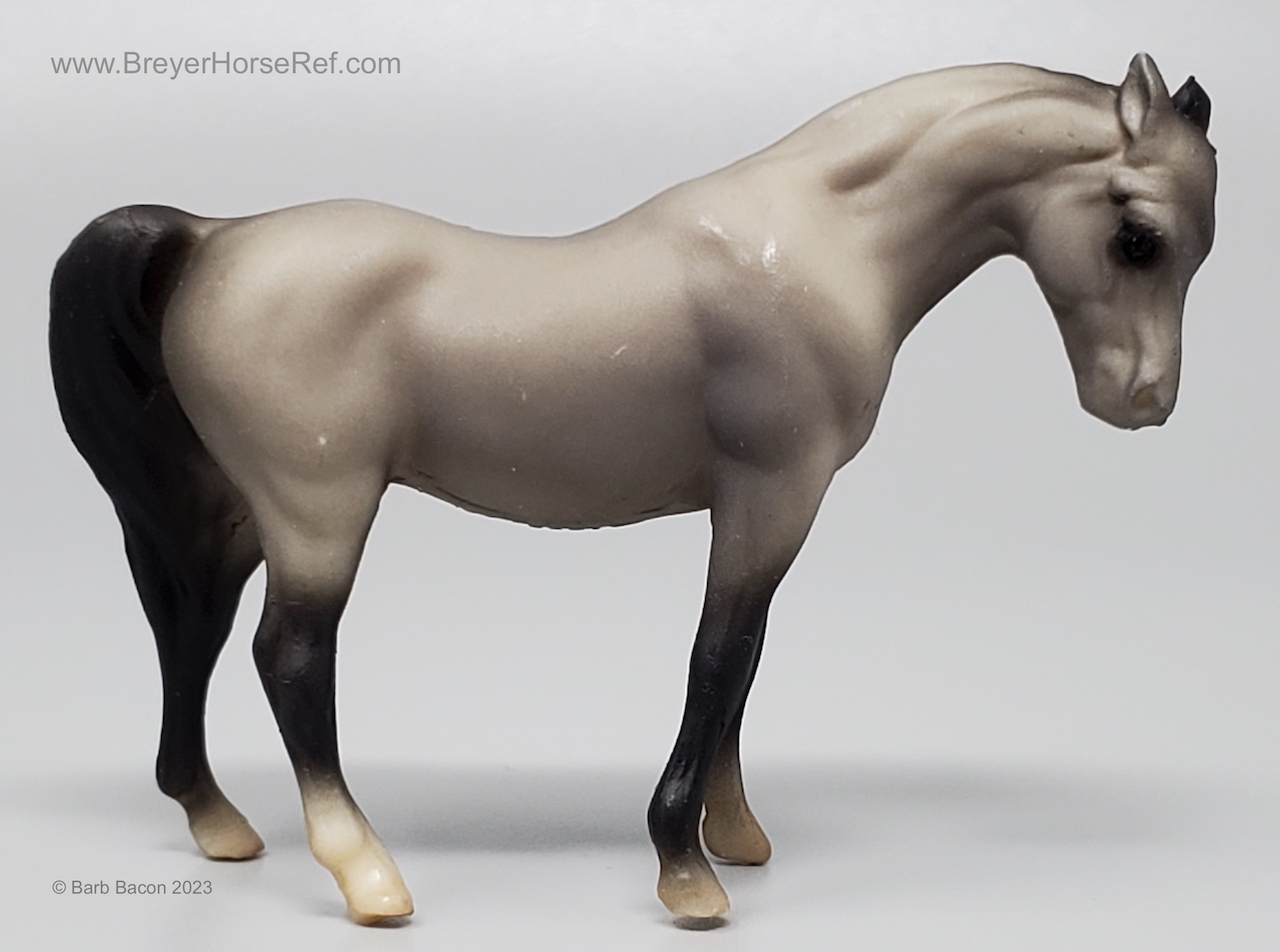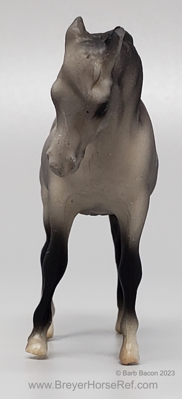 Dark grey with charcoal or black points, vague stockings, tan hooves and solid face. This was the second Saddle Club Collection #5650 (listed as 5650B in this database), produced 1995-1997, and included a dark grey Arabian Mare, sandy bay Citation, chestnut pinto Native Dancer, dark bay Silky Sullivan, and a chestnut leopard appaloosa Swaps. The first collection (see record #5650) was discontinued in 1995, and this set was released later that year. The first collection is the only set pictured in the catalogs from 1994-1997.