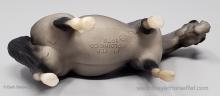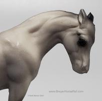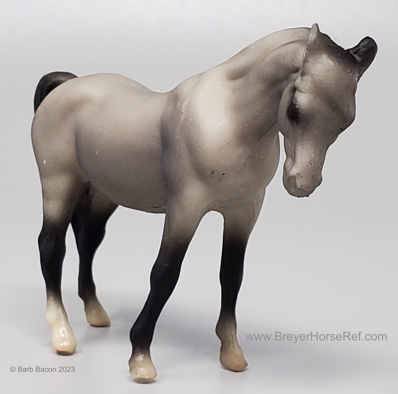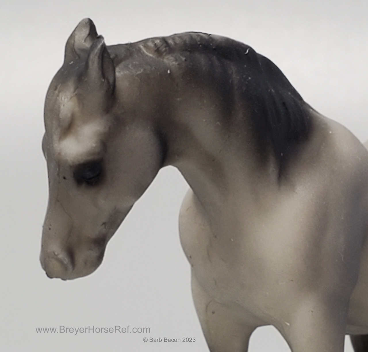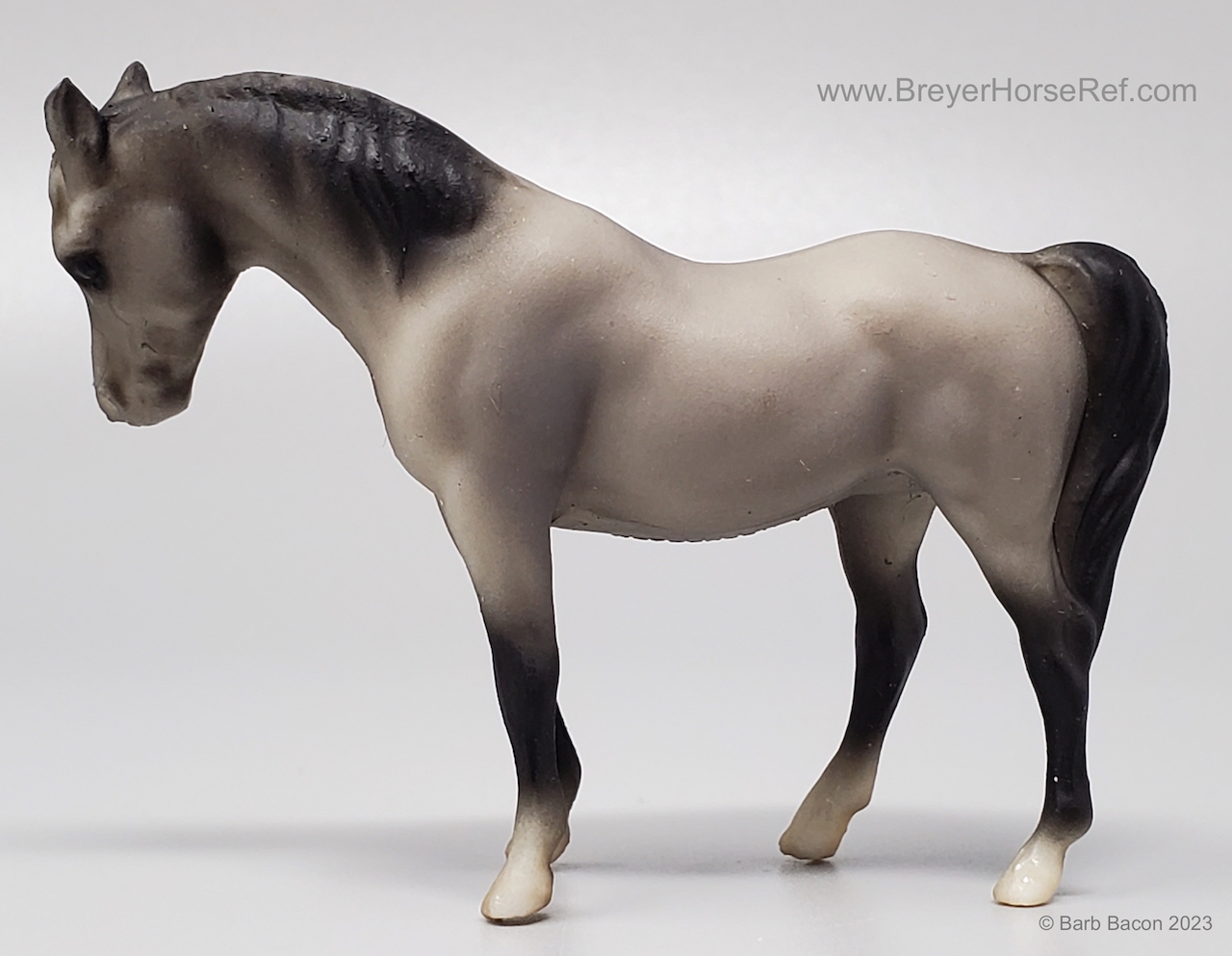 Dark grey with charcoal or black points, vague stockings, tan hooves and solid face. This was the second Saddle Club Collection #5650 (listed as 5650B in this database), produced 1995-1997, and included a dark grey Arabian Mare, sandy bay Citation, chestnut pinto Native Dancer, dark bay Silky Sullivan, and a chestnut leopard appaloosa Swaps. The first collection (see record #5650) was discontinued in 1995, and this set was released later that year. The first collection is the only set pictured in the catalogs from 1994-1997.