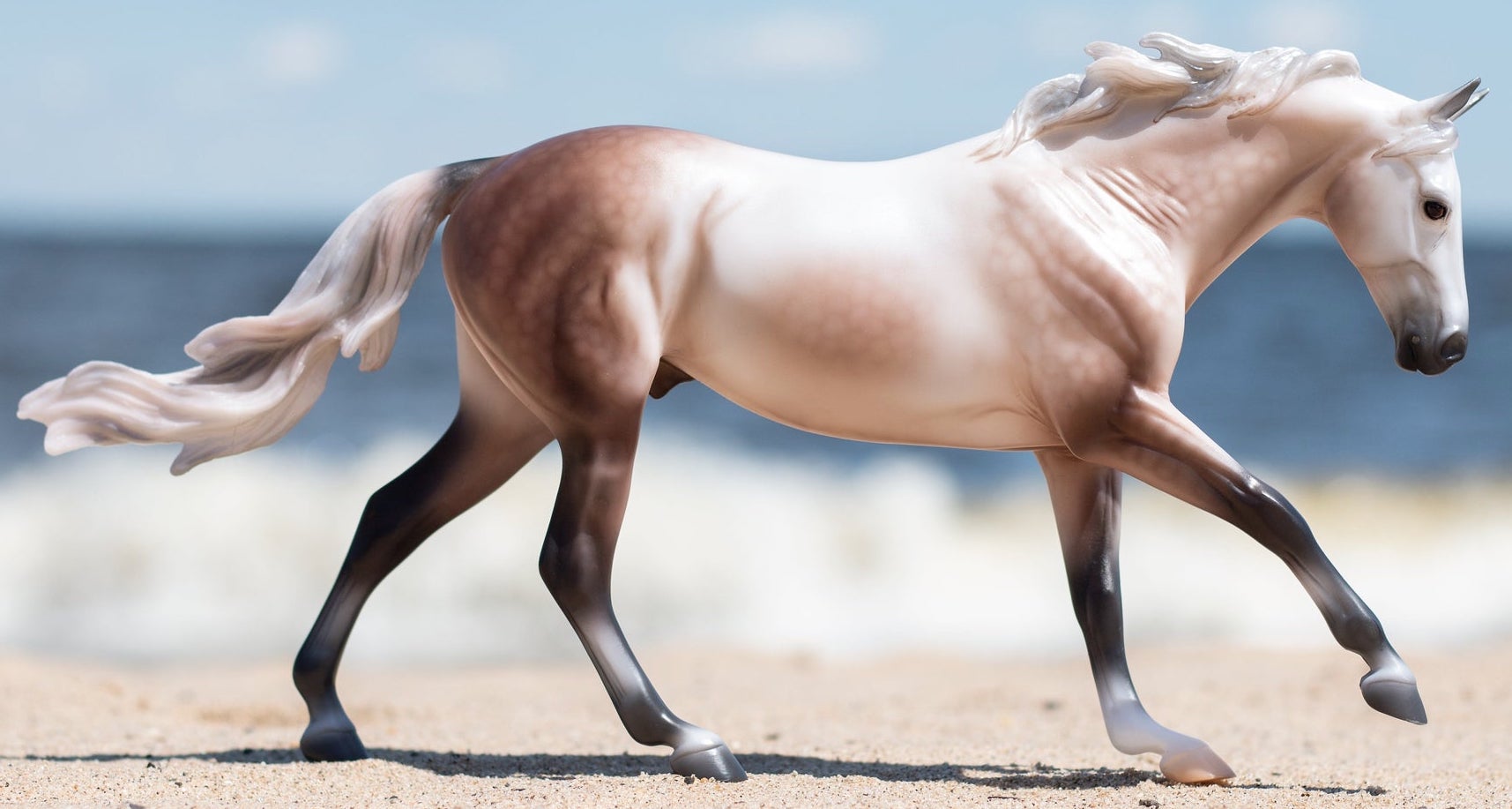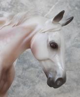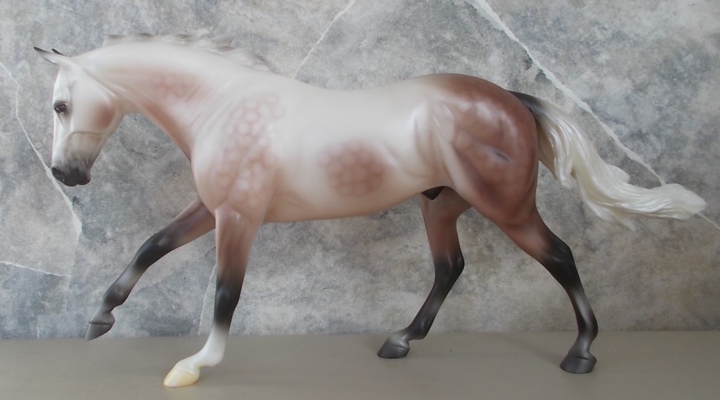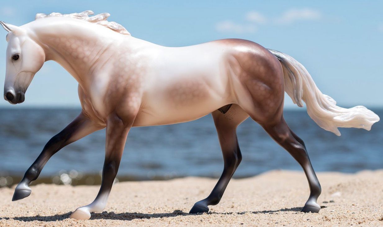 "Carter features an exquisite shaded pearly dapple rose grey coat that mimics the color of the sunrise over snow covered fields. This athletic Quarter Horse is ready to chase down the day and get to work." www.breyerhorses.com. Collector Club 2020 Stamp on belly.