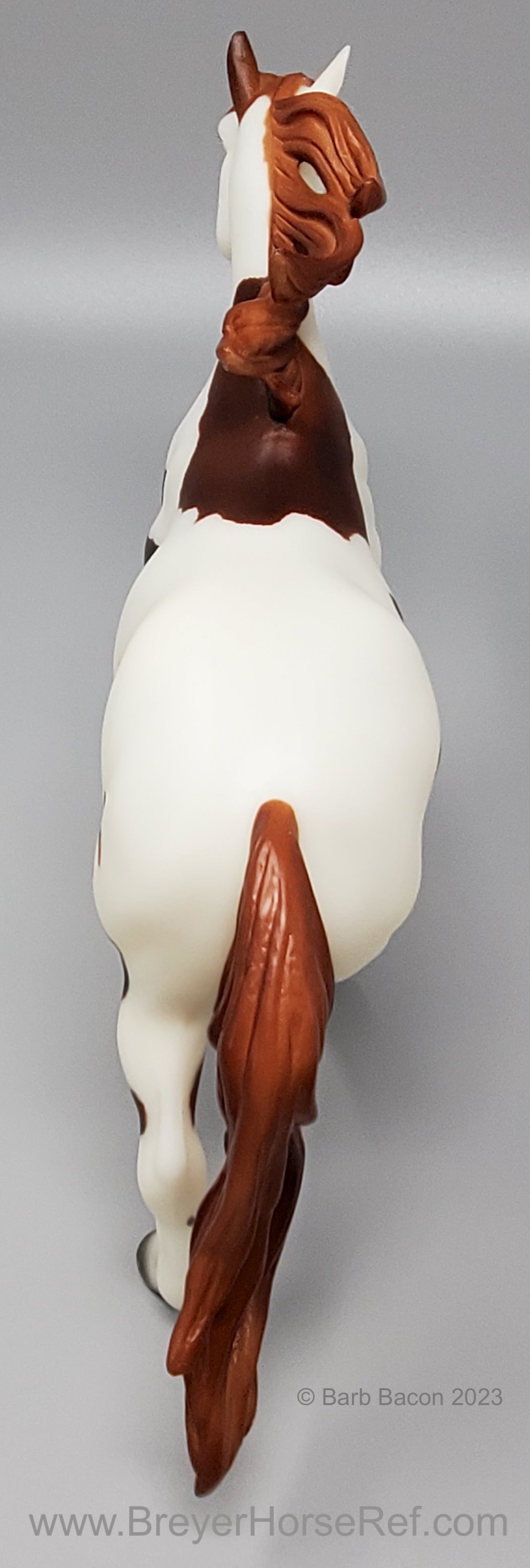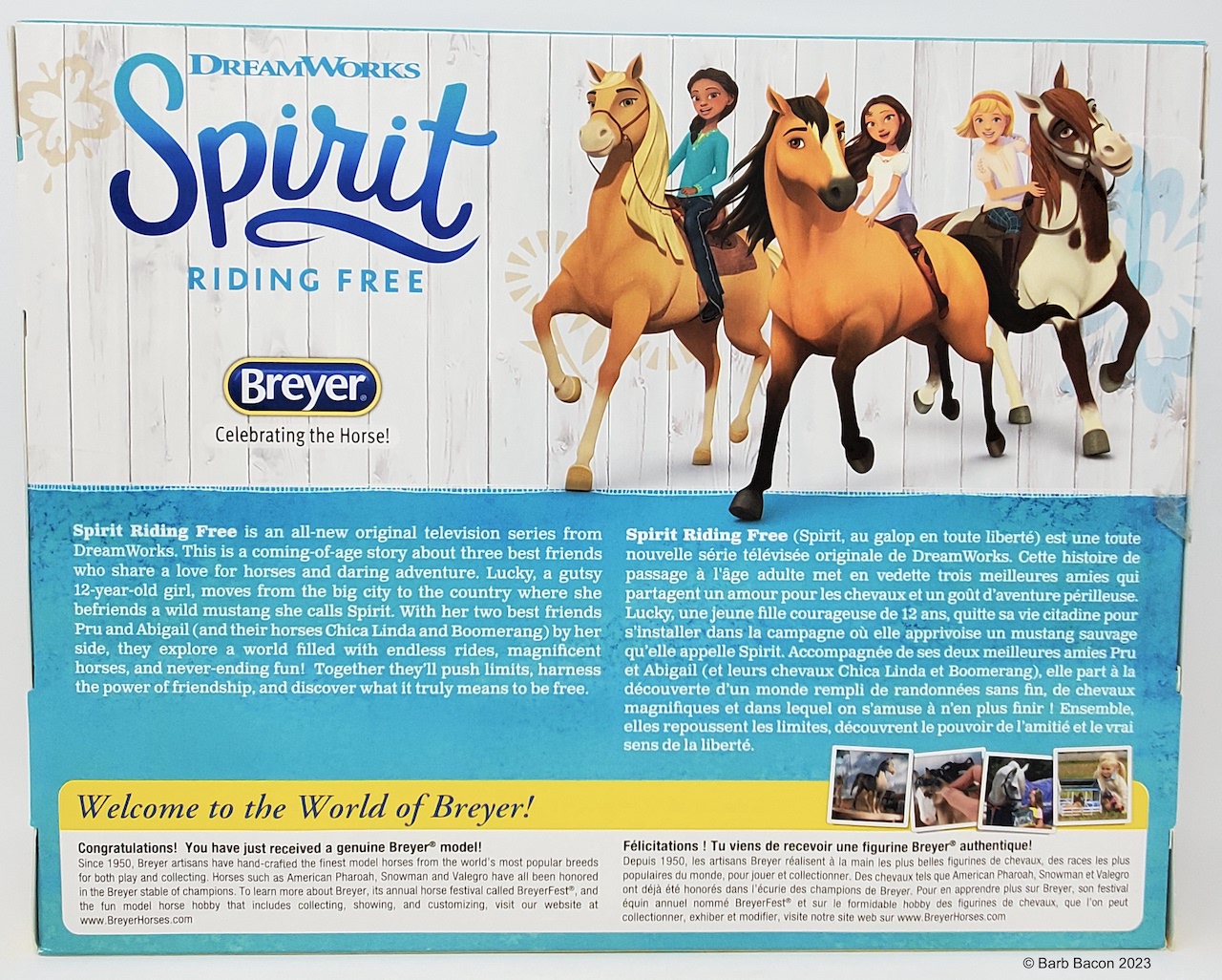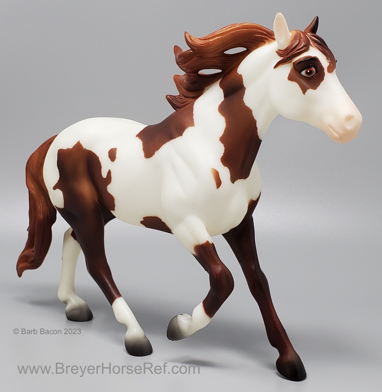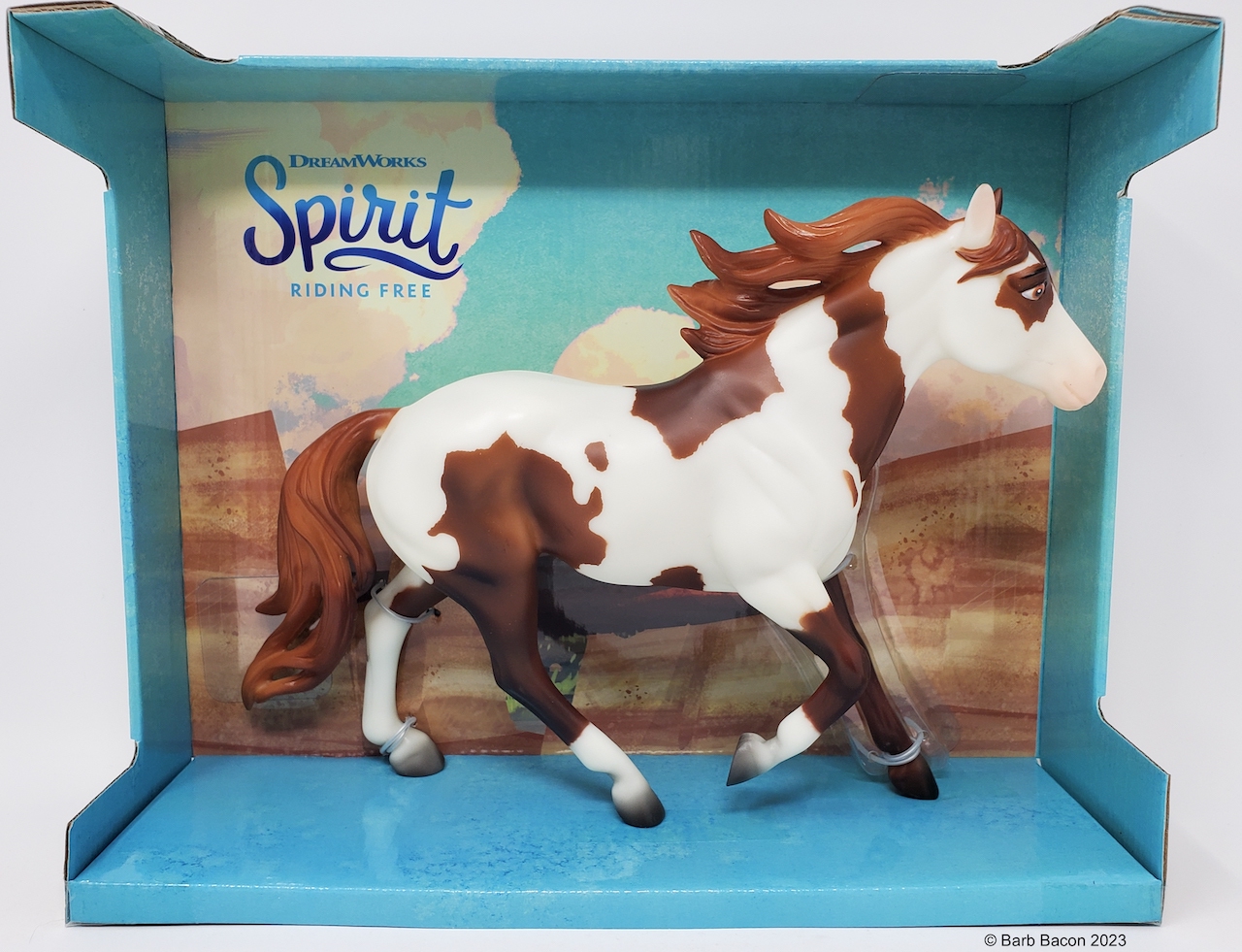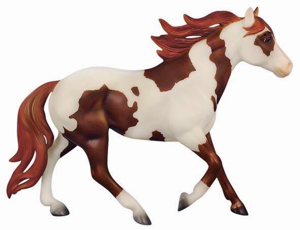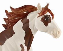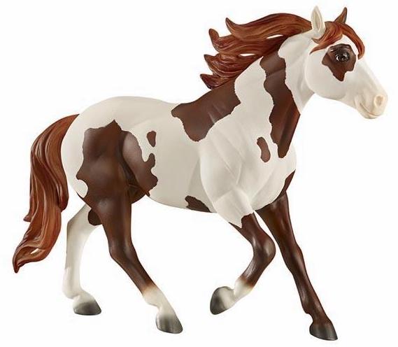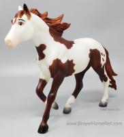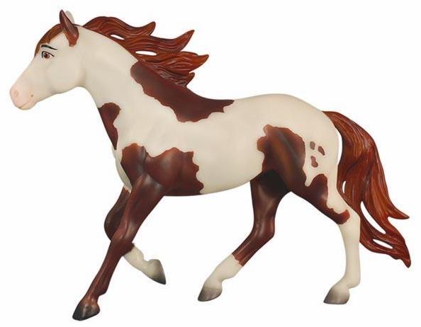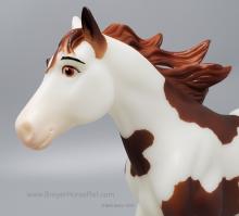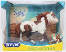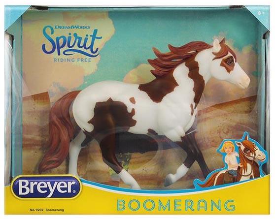 "Breyer®, the maker of the world's finest model horses, has brought to life Boomerang from the all-new DreamWorks series Spirit Riding Free! Breyer's Traditional series portrait models are known around the world for their beauty, quality, and true-to-life details. Abigail's pinto horse Boomerang is a friendly, well-meaning and loyal steed, but he's also a total goofball! His clumsy nature adds laughs to even the direst of misadventures. Boomerang is 1:9 in scale 8"H x 10.5"L, and is shown loping along.” www.breyerhorses.com.