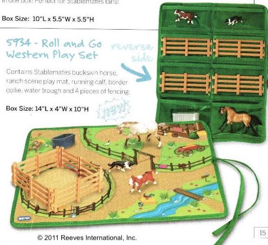 Roll and Go Western Play Set #5934 from 2011-2012. Set included a Running Calf, Border Collie, water trough, fencing and play mat. The buckskin Cantering Warmblood replaced the Appaloosa, unknown if any of the Appaloosa’s were released in this set but that Appaloosa can be seen under record 701736. On the 2012 Retired List.