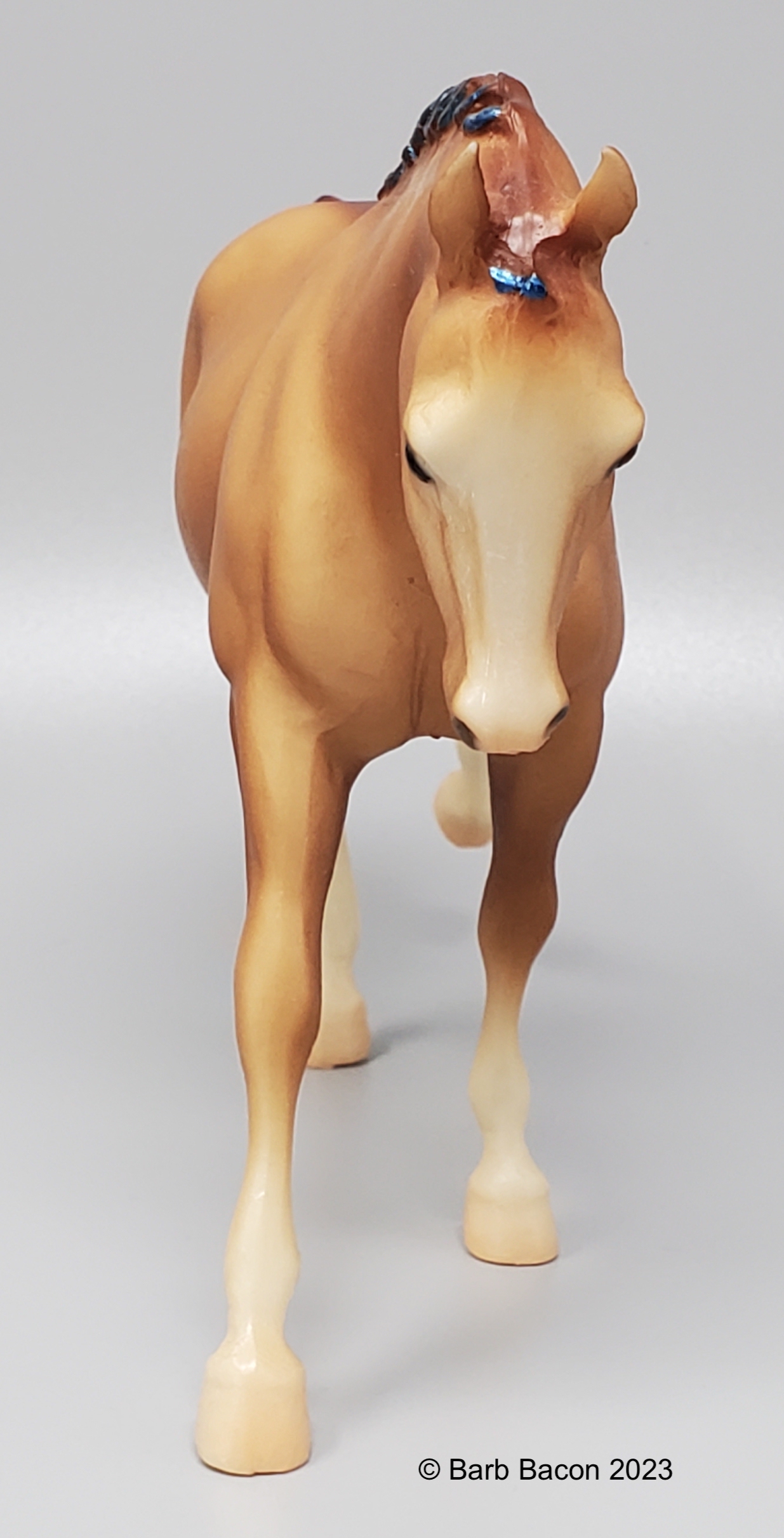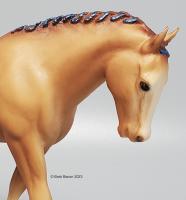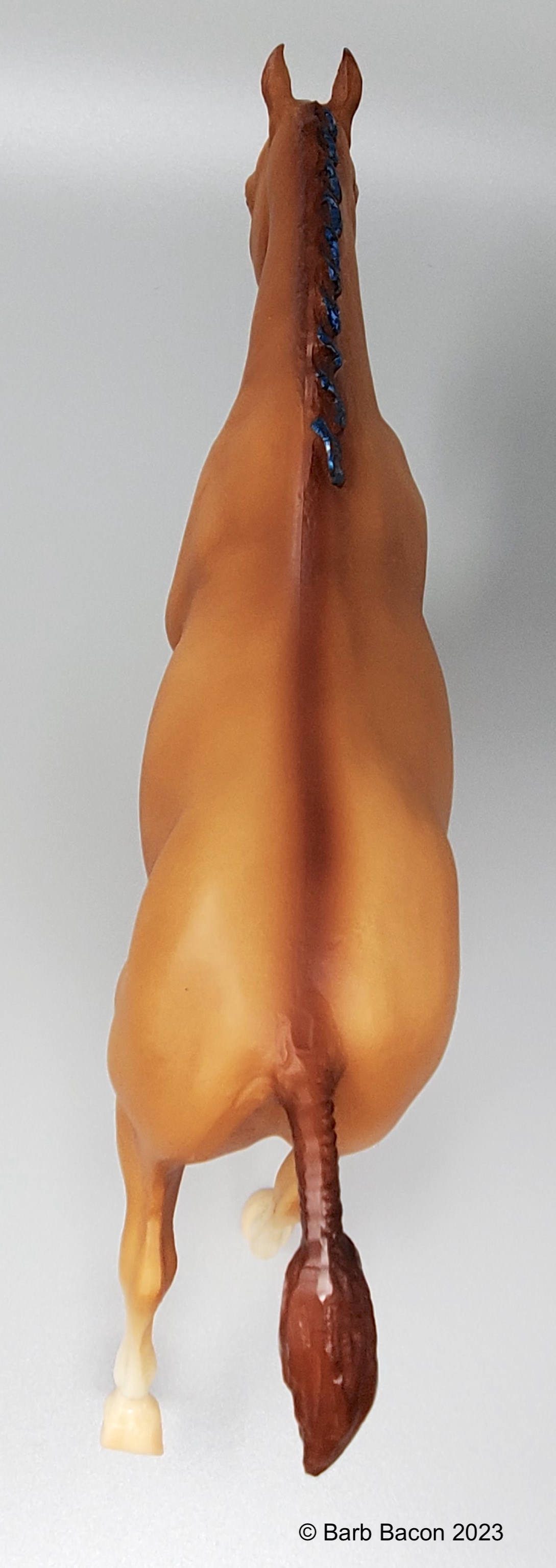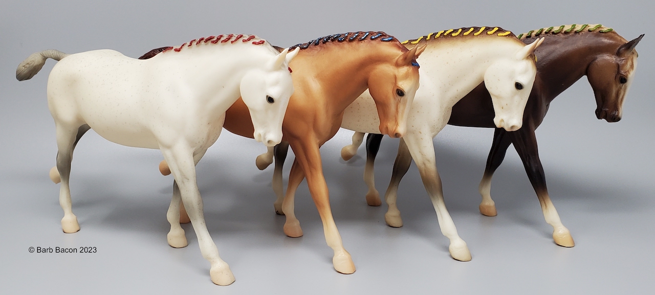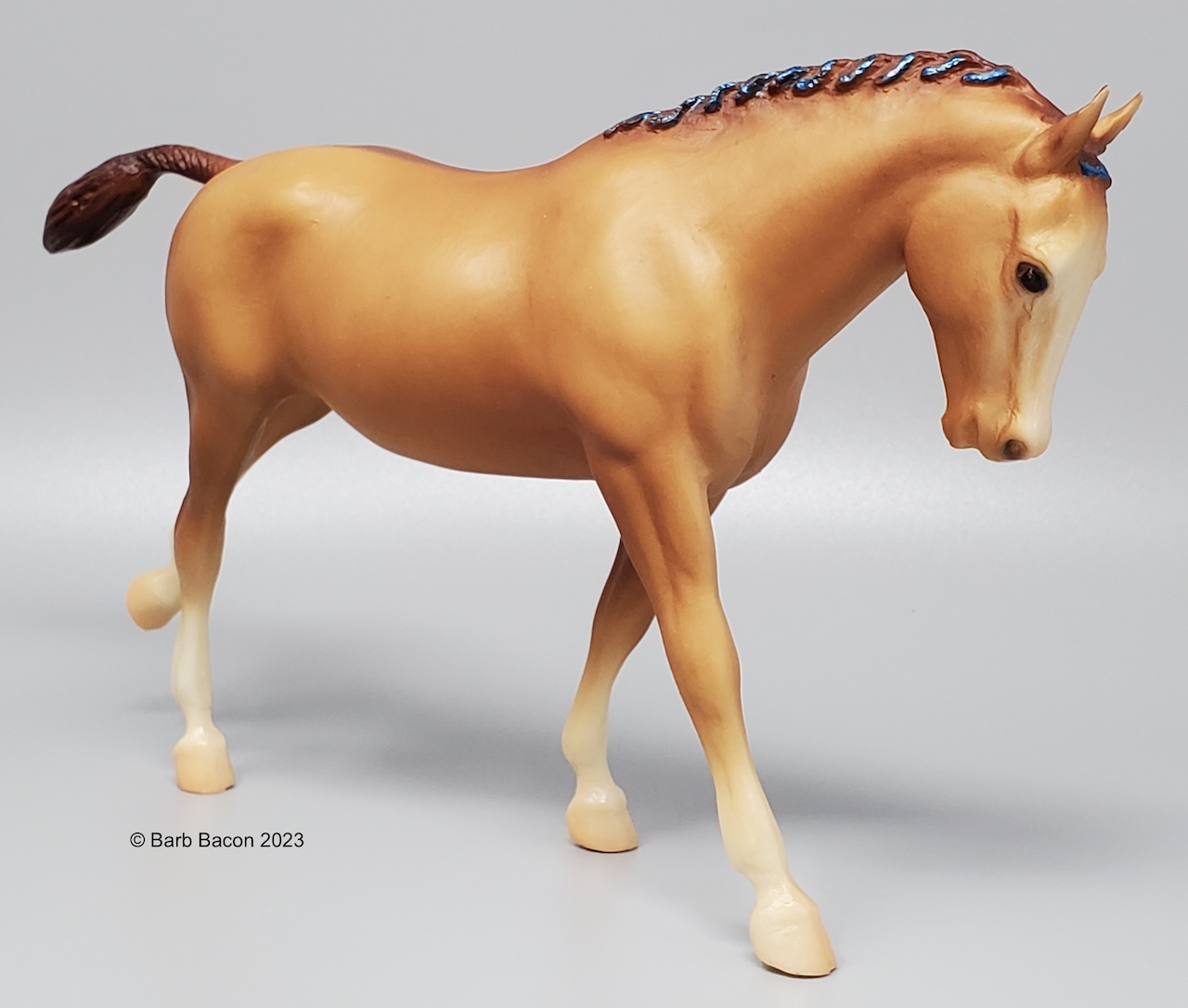 Metallic Blue ribbons in the mane and forelock. Could be purchased separately or in a set with the Liver Chestnut, Flea-bitten Grey, Red Dun, and Red Roan Cantering Welsh Ponies. These models came with a COA from Small World.