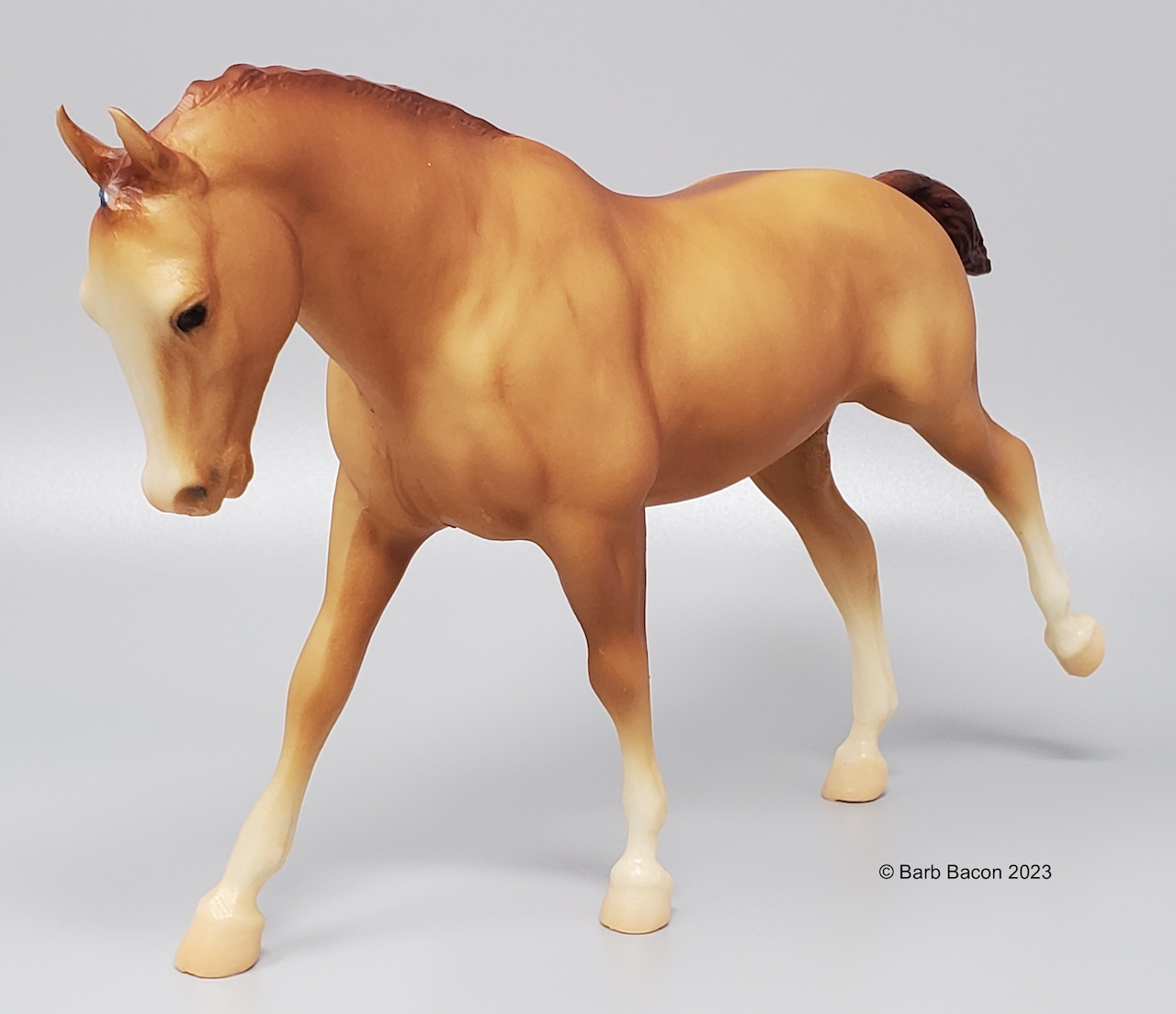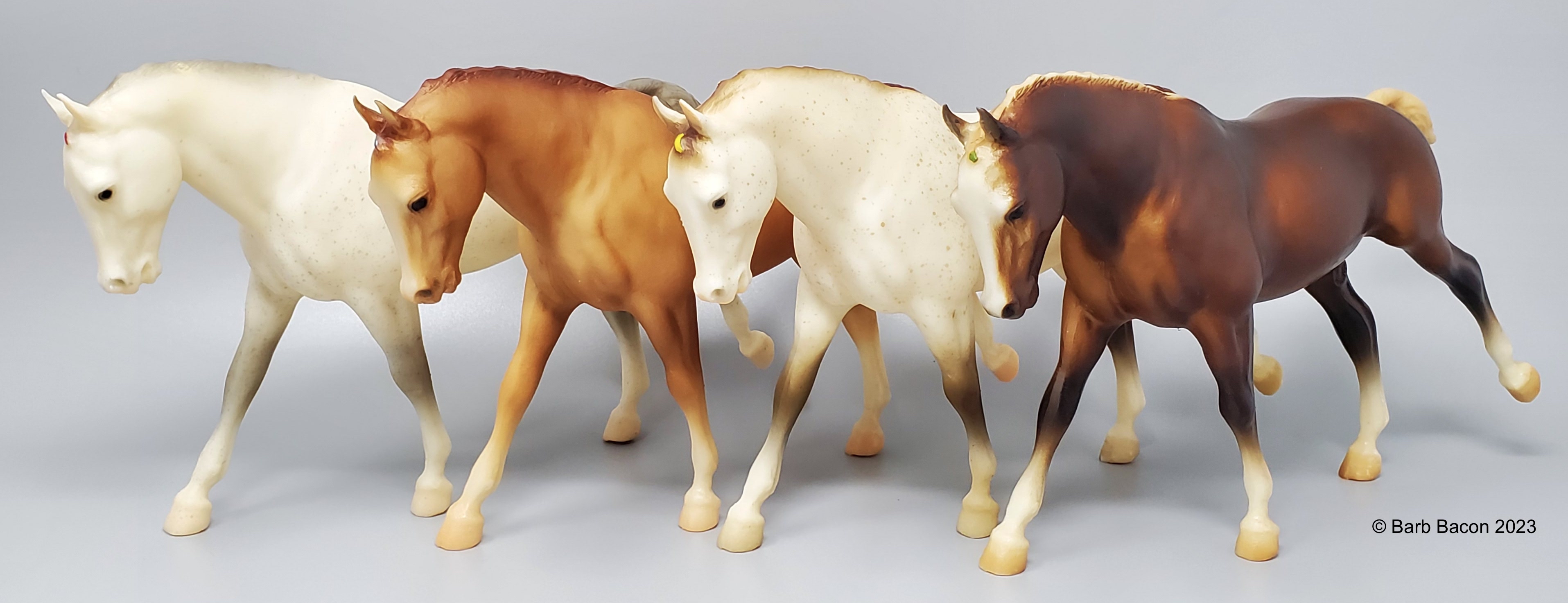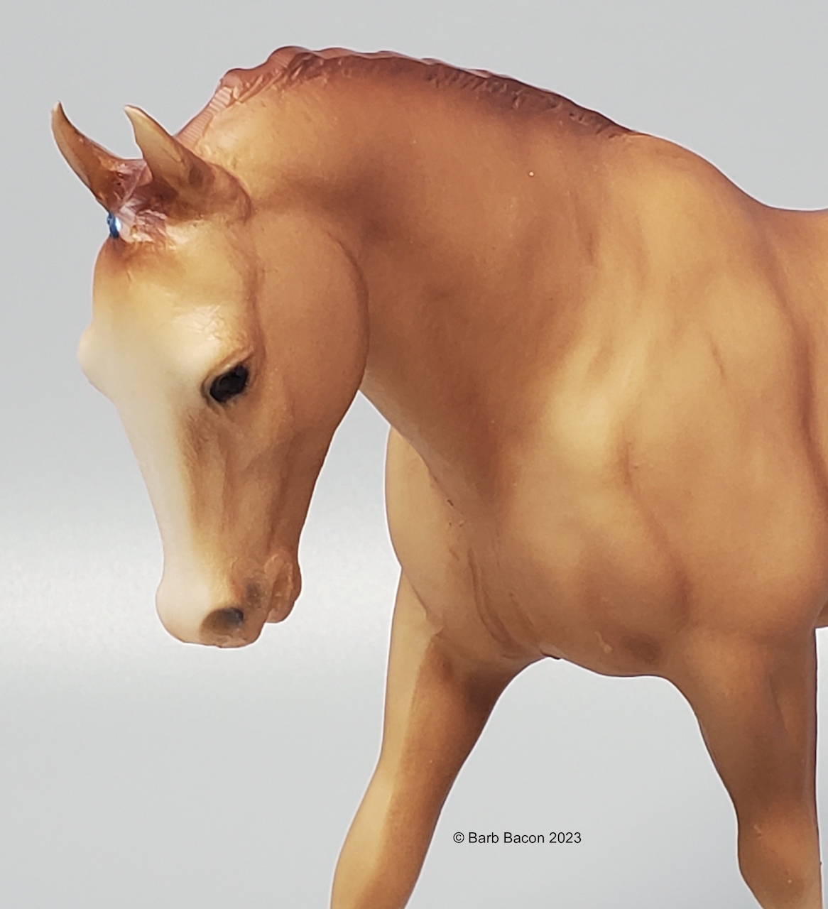 Metallic Blue ribbons in the mane and forelock. Could be purchased separately or in a set with the Liver Chestnut, Flea-bitten Grey, Red Dun, and Red Roan Cantering Welsh Ponies. These models came with a COA from Small World.