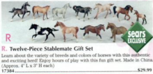 This set was released by Sears in 1998 as the 12 Piece Stablemate Gift Set #17384. The set included a red roan Arabian Stallion, chestnut peppercorn Citation, rose grey Draft Horse, bay appaloosa Morgan Stallion, bay Quarter Horse Stallion, rose grey Saddlebred, black pinto Seabiscuit, red dun Seabiscuit, dapple grey Swaps, liver chestnut Thoroughbred Mare, and a bay appaloosa Thoroughbred Lying and Standing foal.
