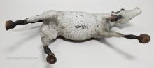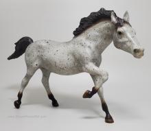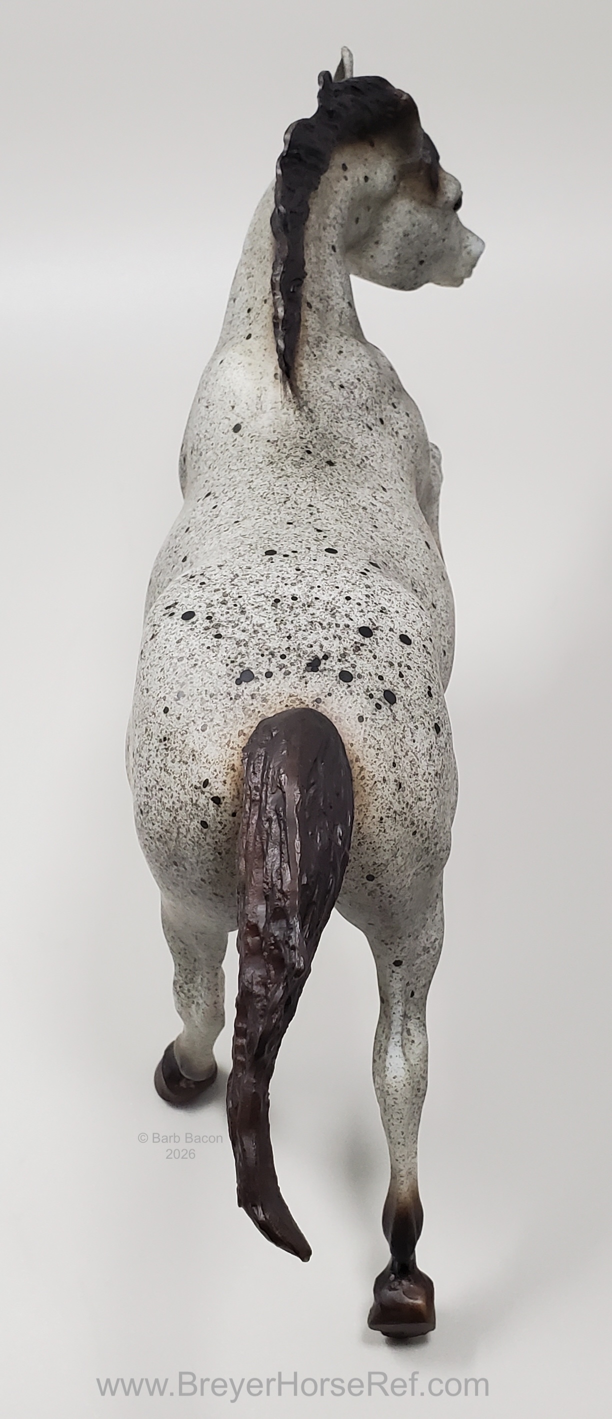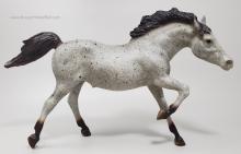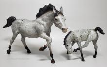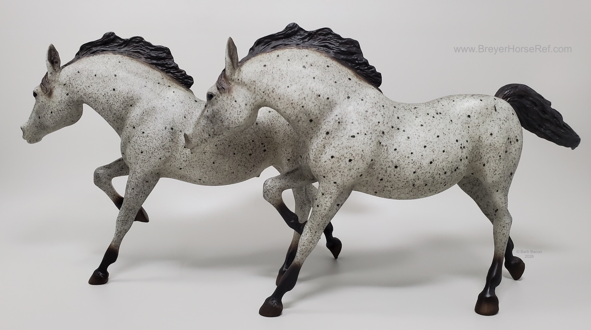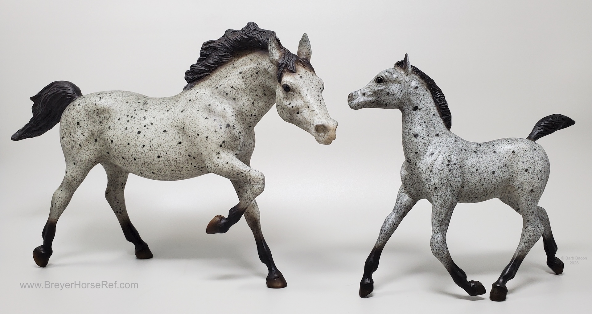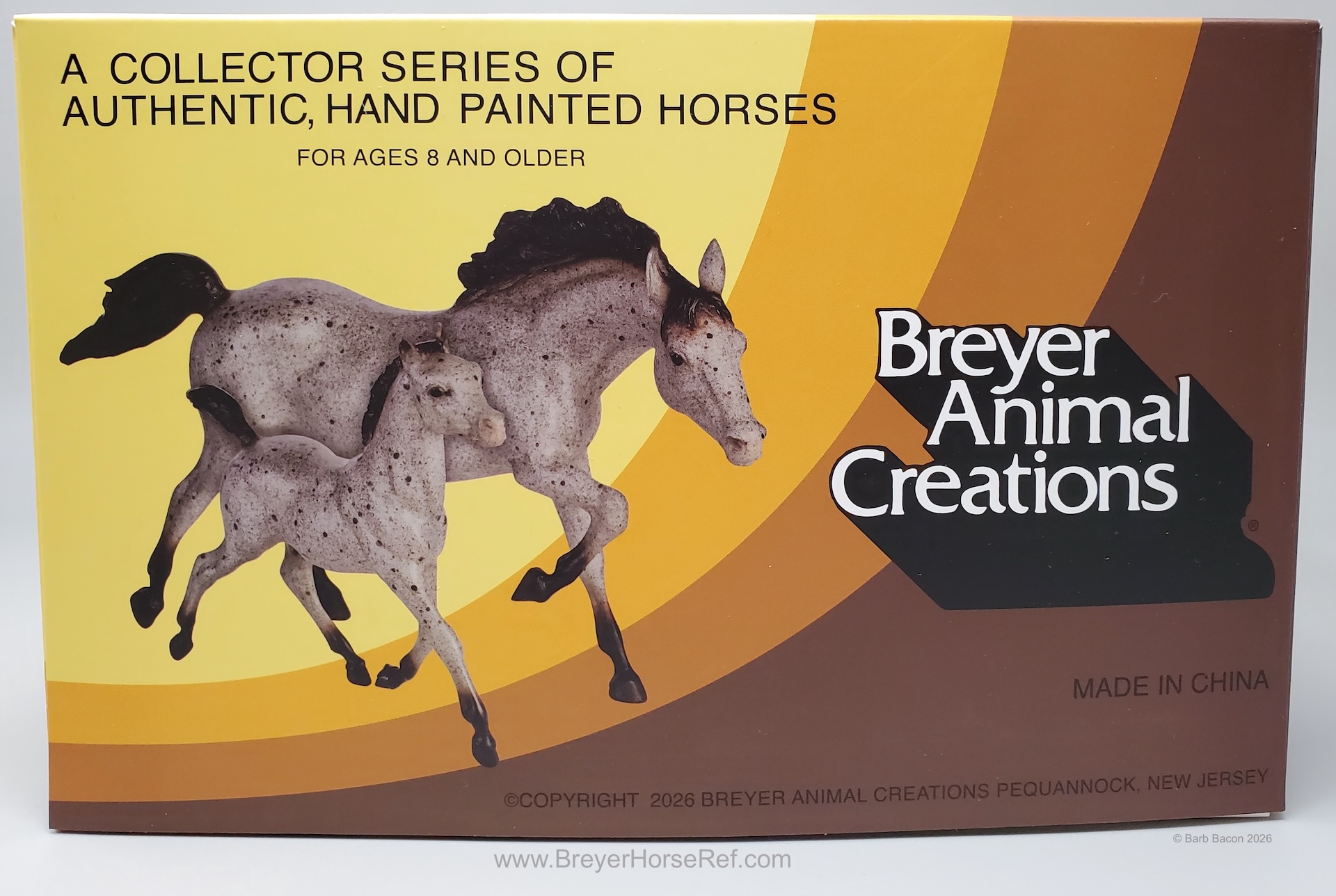 "The First Release of the 2026 Vintage Club - Sentinel & Echo! In the early 1960s, Breyer's "red roan" colorway debuted. Intending to mimic the color of real-life red roan horses, the final product was instead a fanciful reddish-tan with dark freckling that toed the line between a realistic and decorator color. A companion color in "blue" roan was never officially released - until now! The Running Stallion, one of the original wearers of the red roan colorway, has the honor of wearing this striking blue roan coat for its debut as Sentinel. He's accompanied by his foal, Echo, who is evenly split between two different molds: the Running Foal and the Scratching Foal. Which version of Echo you receive will be a surprise!" www.breyerhorses.com.