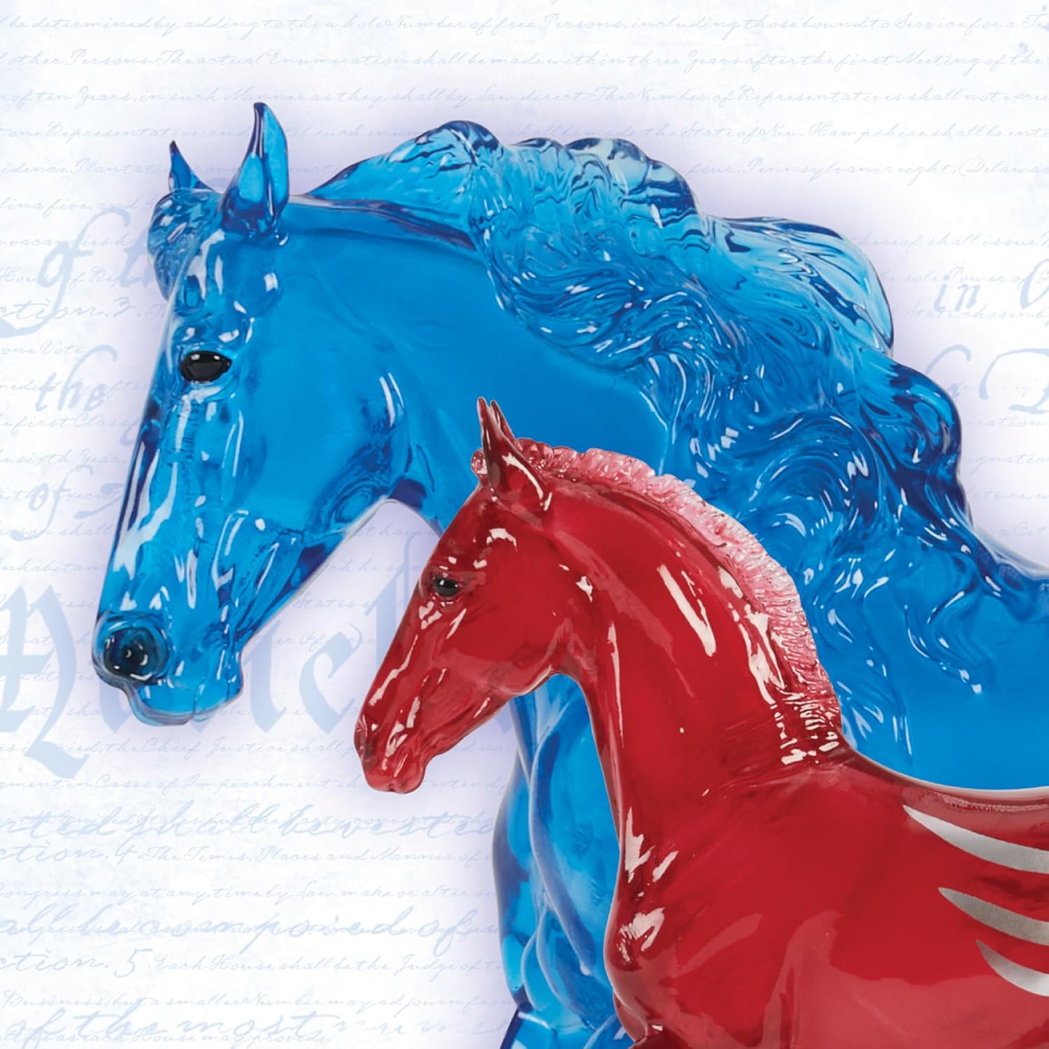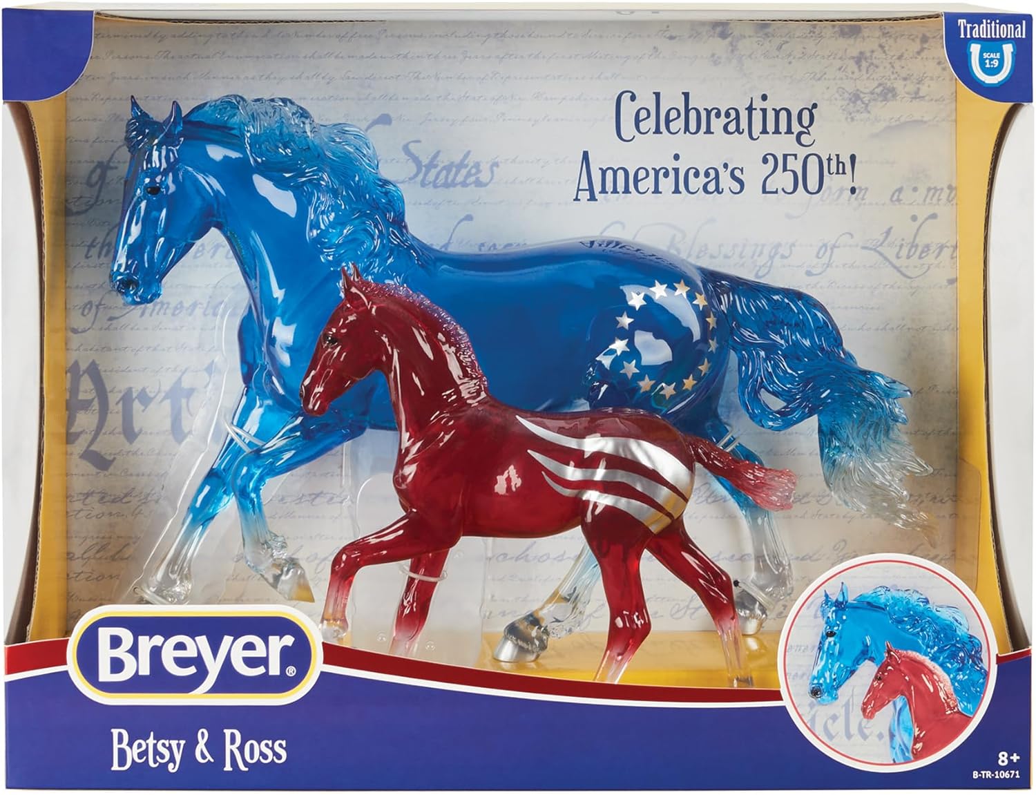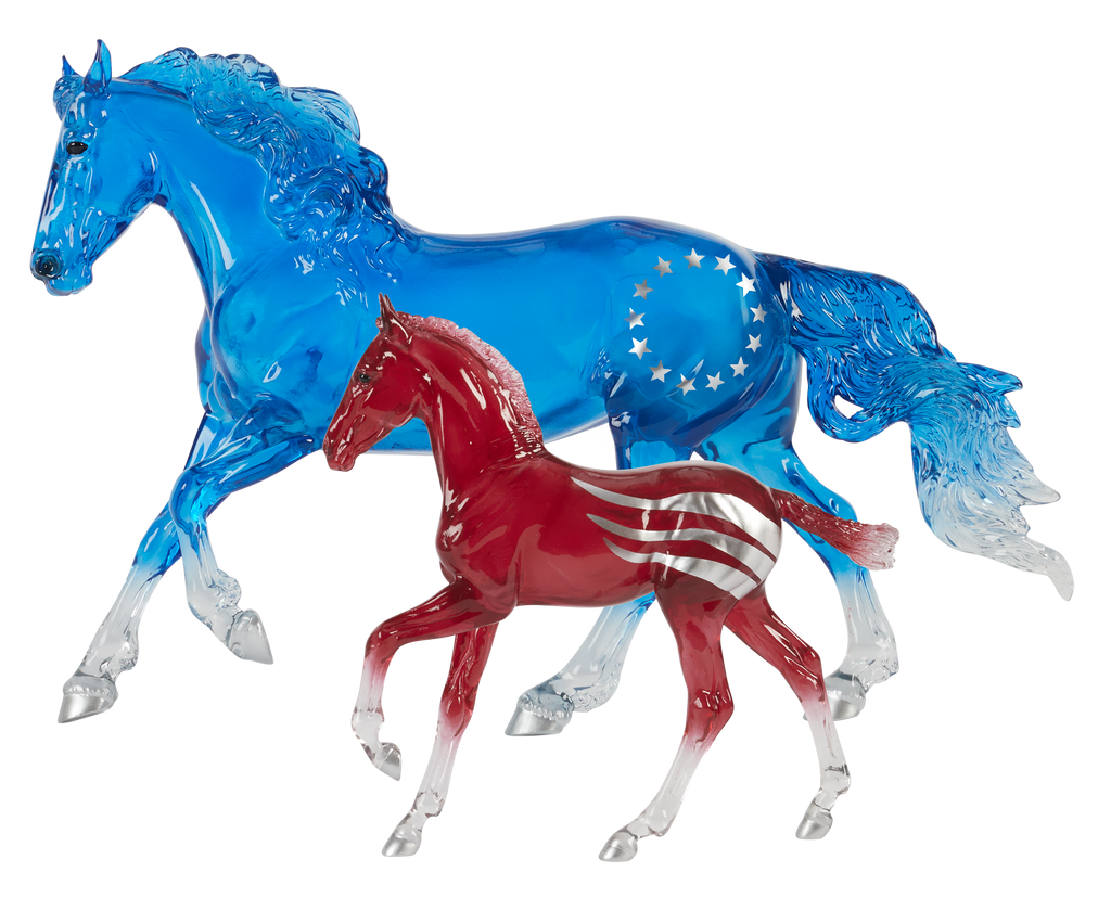 "Celebrate America's semiquincentennial - that's a fancy way to say 250th anniversary! - with Betsy & Ross, a clearware Mustang mare and foal named for the maker of the first American Flag, Betsy Ross. Mare Betsy is decorated with the classic 13 stars arranged in a circle on her hip, and foal Ross carries the accompanying stripes." www.breyerhorses.com.