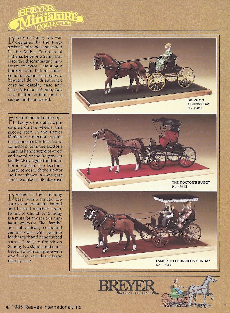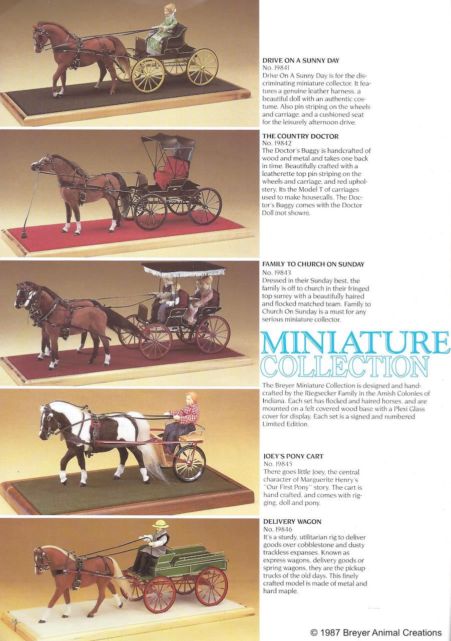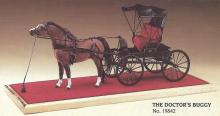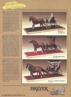 Bay flocked with black points, black faux hair mane and tail, 3 stockings with painted black hooves, and a blaze. This set included a a black leather harness, wood and metal buggy, and a ceramic doctor doll. Mounted on a wooden base with a plastic display cover. Made by Riegseckers, and hand signed and numbered. This set was not shown in the 1987 catalog, but available on dealer price lists.