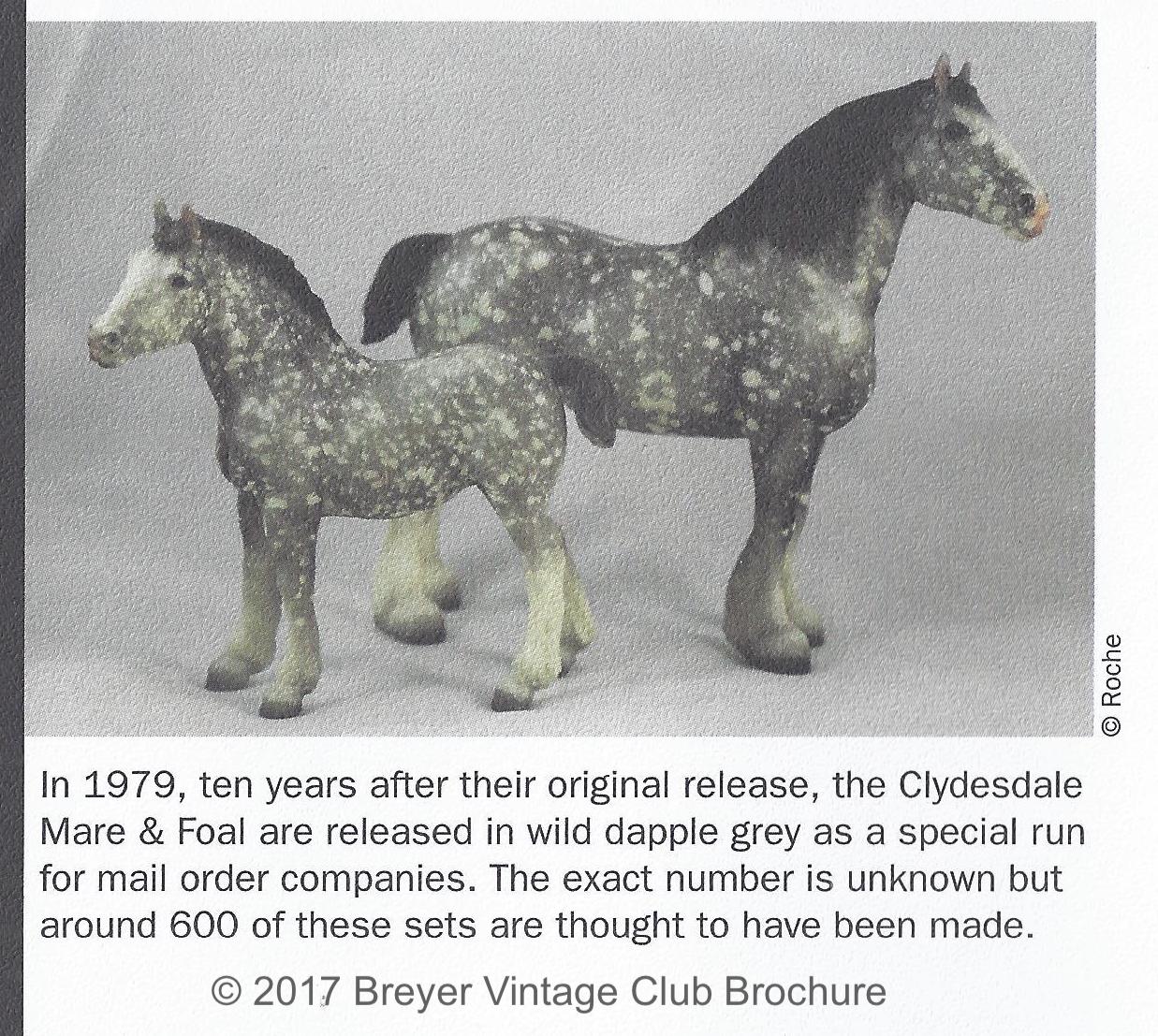 Dapple grey with extensive dappling, 4 socks with grey hooves, pinking on nose and ears, and bald or light grey face. Released through Bentley Sales and Mission Supply House. Estimated 300-350 models made. It is estimated this foal was actually released in 1980 to match the dapple grey Clydesdale Mare and Stallion special runs from 1979.
