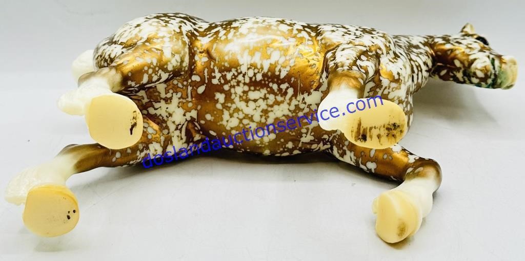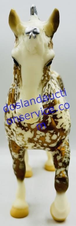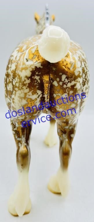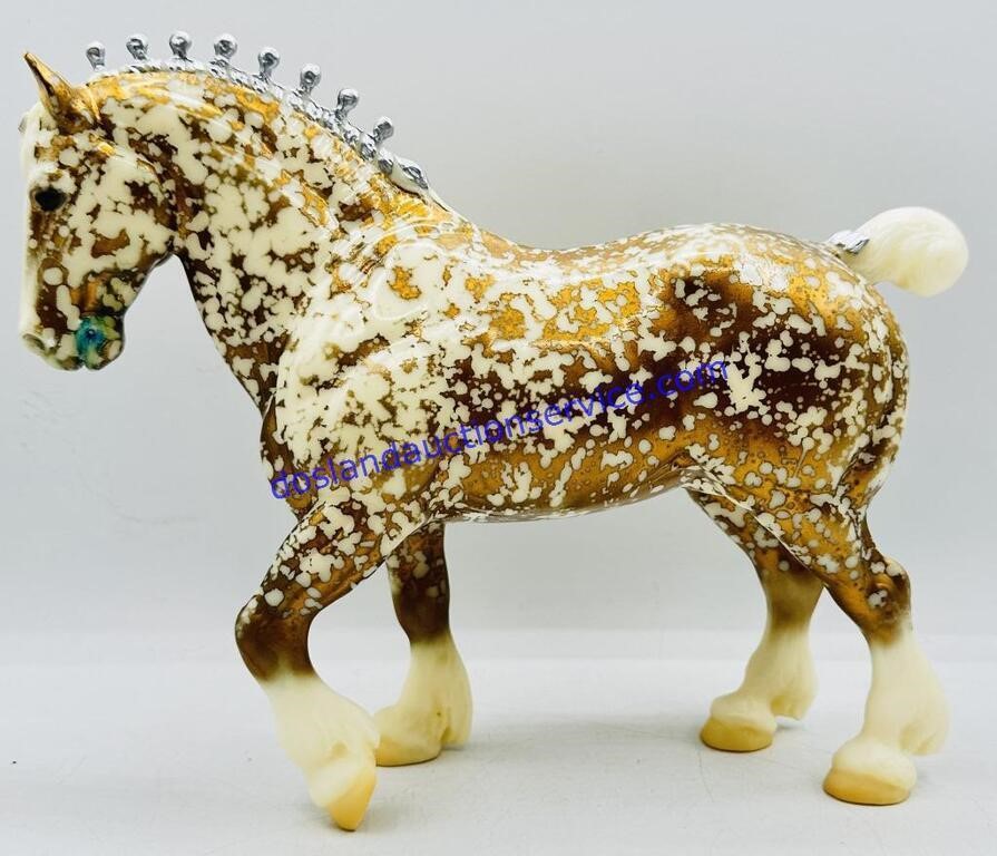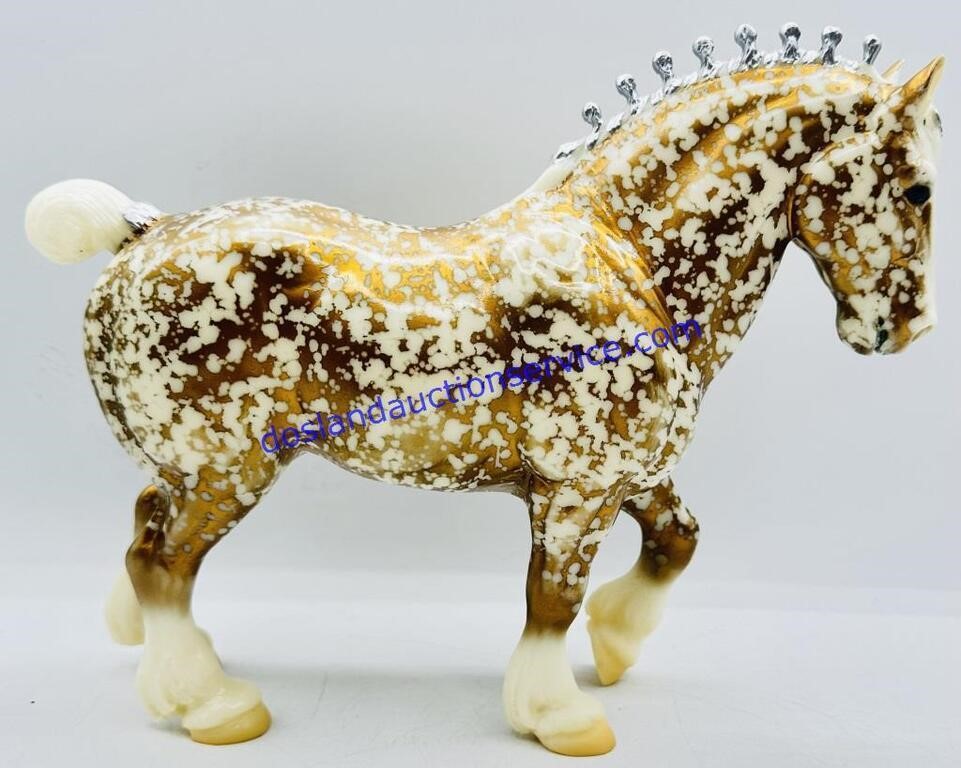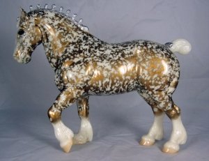 "This model was the 2002 BreyerFest Volunteer model. It's painted in one of Breyer's signature decorator colors: gold florentine with silver metallic bobs. The Clydesdale mold is #80 and it was sculpted by Chris Hess in 1958." www.breyerhorses.com.
