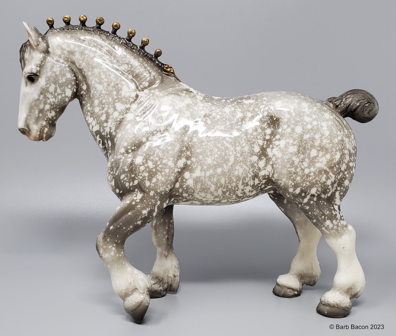 This model was released through Bentley Sales, and possibly Mission Supply House in 1979-1980. Dapple grey with dapples on the head and neck, four stockings with grey or pink hooves, bald face with pinking on the nose and in the ears, and gold mane and tail ribbons. Most models were matte or semi-glossy, though glossy models also exist. The only difference between these glossy models and the regular run (muscle version) from 1961-1967 is the addition of the USA Stamp. Both the glossy and matte models were heavily dappled, and the semi-gloss version had more sparse dappling and a light grey tinge to the stockings and face. An estimated 355-710 models made.