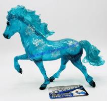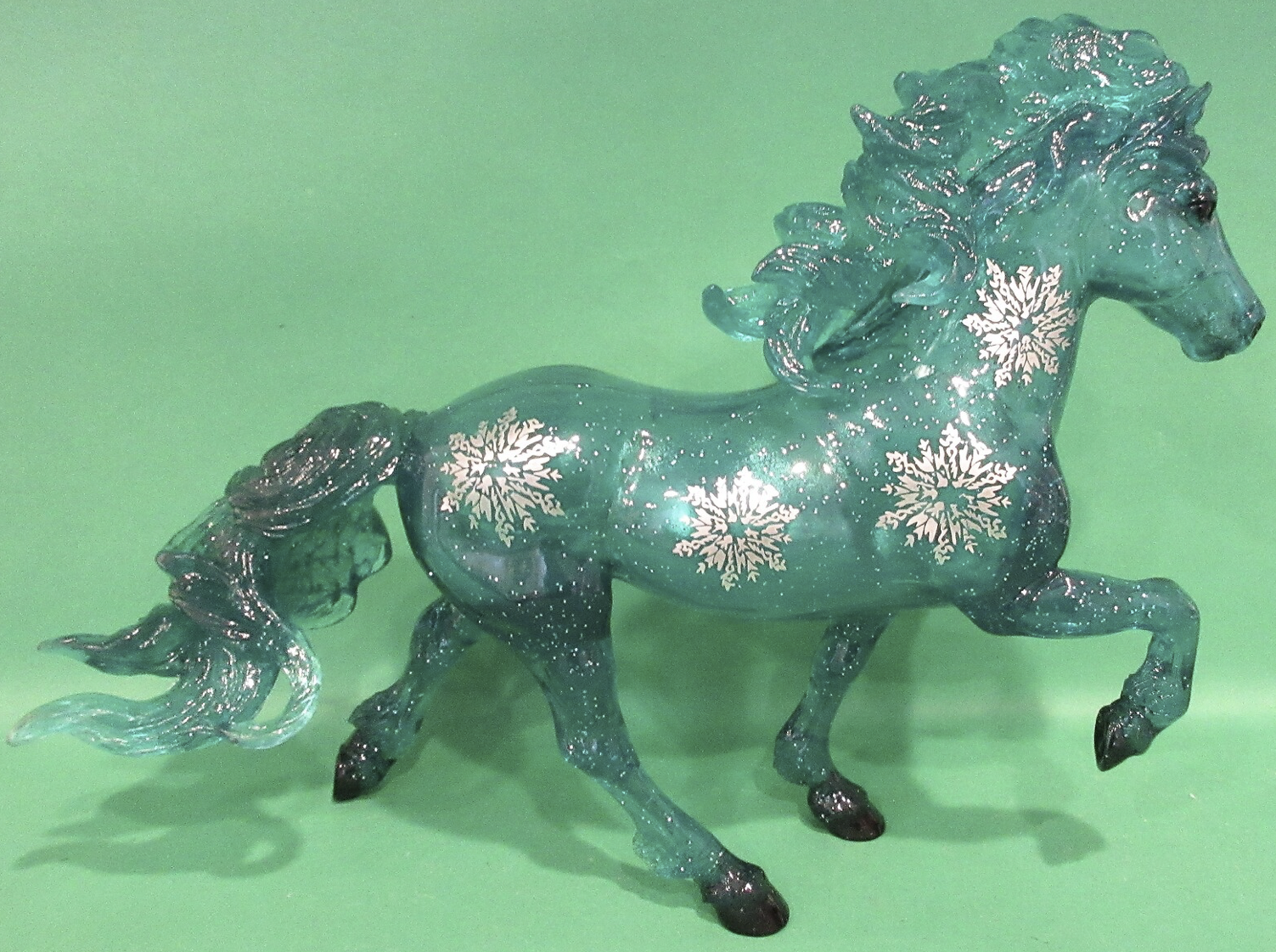 "With a name that means "Christmas" in Icelandic, feisty Icelandic horse Jól is a beautiful homage to the colors of the holiday season and the joys of winter. Captured in an energetic tölt, this Collector Club exclusive features delicate snowflakes on his sides, as well as glitter detailing and a glossy finish. Jól comes in three festive colors. Which color you’ll receive will be a surprise, but each will have you shouting “Gleðileg jól” (Merry Christmas)! Warning: Members on the naughty list may receive one of 12 pieces of “Coal,” a high-gloss, solid black model." www.breyerhorses.com. Jól 2020 Stamp on belly.