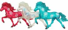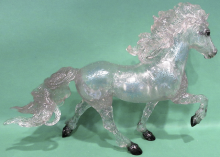 "With a name that means "Christmas" in Icelandic, feisty Icelandic horse Jól is a beautiful homage to the colors of the holiday season and the joys of winter. Captured in an energetic tölt, this Collector Club exclusive features delicate snowflakes on his sides, as well as glitter detailing and a glossy finish. Jól comes in three festive colors. Which color you’ll receive will be a surprise, but each will have you shouting “Gleðileg jól” (Merry Christmas)! Warning: Members on the naughty list may receive one of 12 pieces of “Coal,” a high-gloss, solid black model." www.breyerhorses.com. Jól 2020 Stamp on belly.