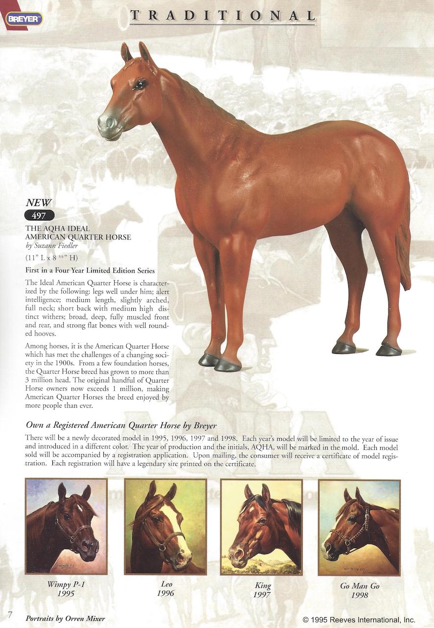 1st out of 4 in the Foundation Sire Series. Came with a Registration application. Brown chestnut with darker mane and tail, slight grey stripes in tail, dorsal stripe and no white markings. Based on one of the major foundation stallions of the Quarter Horse breed from a painting by Orren Mixer, as seen pictured in the 1995 catalog. However, this model is not an actual portrait, but a representation of an offspring of Wimpy P-1. Model has an 'AQHA '95' stamp on the inner back left leg.