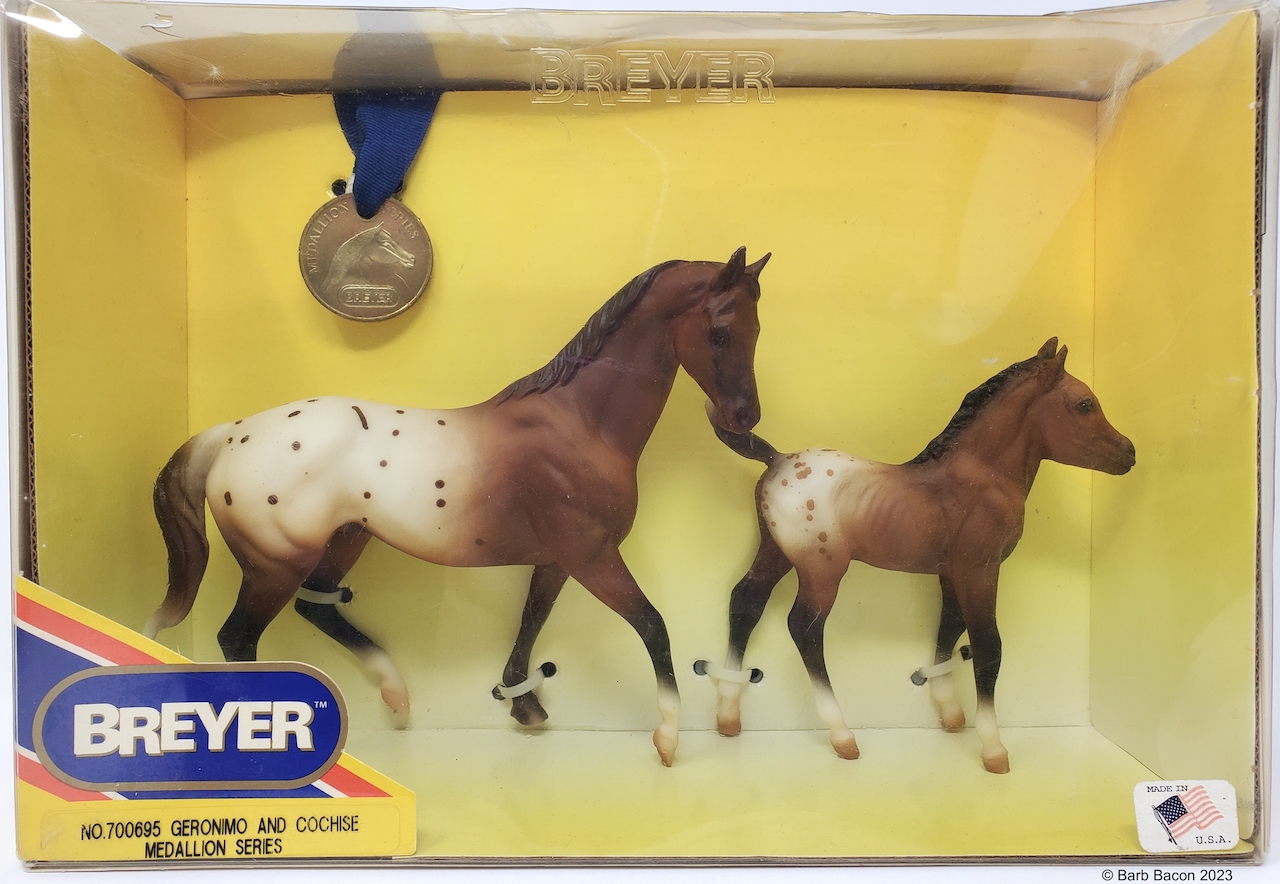 Set included a blanket chestnut appaloosa Sea Star (Cochise) and Kelso (Geronimo), and a ToysRUs medallion. ToysRUs Exclusive.