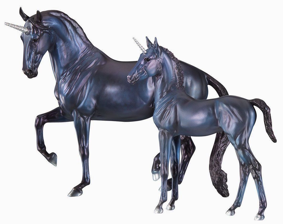 "The bond between a mare and foal knows no bounds, and this celestial unicorn mare and foal show just that! Bellatrix gets her name from a star found in the constellation Orion, and its temperature gives the star its characteristic blue-white hue. Her filly Spica is named after one of the brightest stars in the night sky, which is found in the constellation Virgo. These unicorns have shaded dark blue/black coats with subtle dappling, and striking silver hooves and horns. A layer of purple interference makes this pair appear truly magical!" www.breyerhorses.com. Available as a Limited Edition Web Exclusive and pictured in the 2020 Winter catalog.