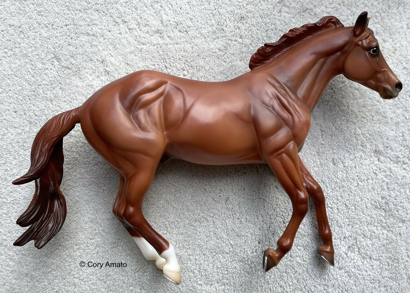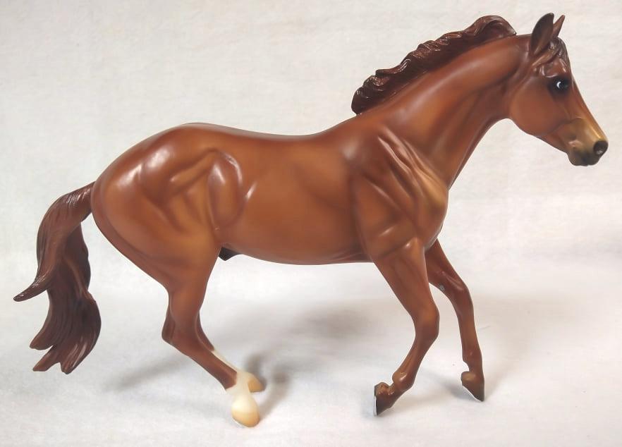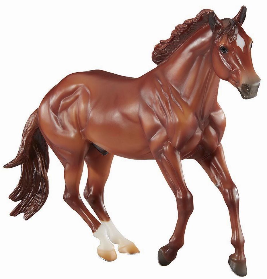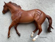 "The exciting sport of Mountain Trail combines the thrill of natural obstacles found on wilderness trails with top-notch horsemanship skills. Owned by Mountain Trail pioneer Mark Bolender, Checkers has won the overall high point and National Champion titles in 2008, 2009, and 2010 – all while being ridden without a bridle. Checkers is an American Quarter Horse gelding, with a registered name of Sir Rugged Chex. His grandsire is the famous Rugged Lark." www.breyerhorses.com.