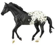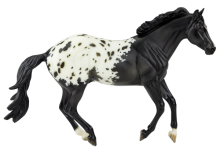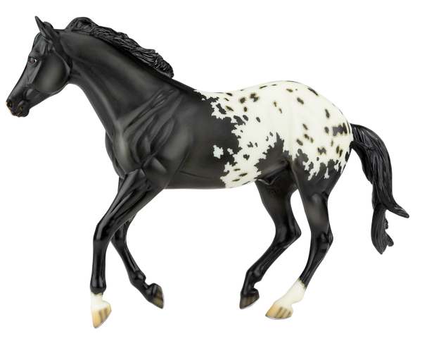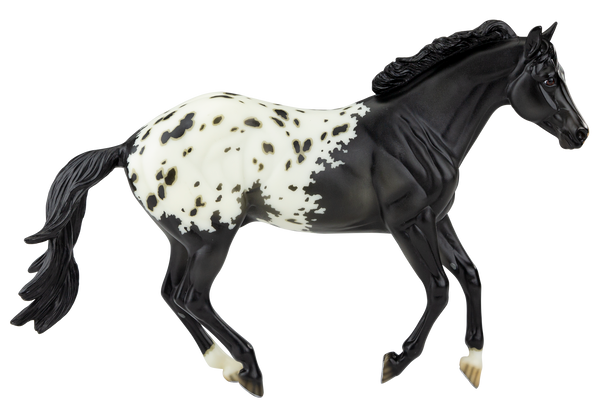 "This county in southwest England retains a distinct cultural identity that reflects its history and is one of the Celtic Nations. This part of Britain has rich history and folklore and names among its early rulers King Mark of Cornwall (of the Tristan and Iseult legend) and King Arthur. Its flag, St. Piran’s Flag, is a white cross on a black background. Cornwall, the grand prize for this year’s Best Customs Contest winners, was originally sculpted and designed by Sommer Prosser as Latigo (mold #728). He has been re-imagined in a stunning shaded black blanket appaloosa using the same pattern as his first release in the Premier Club back in 2013. With mapped spots in his blanket, detailed striped hooves, and silver shoes." www.breyerhorses.com.