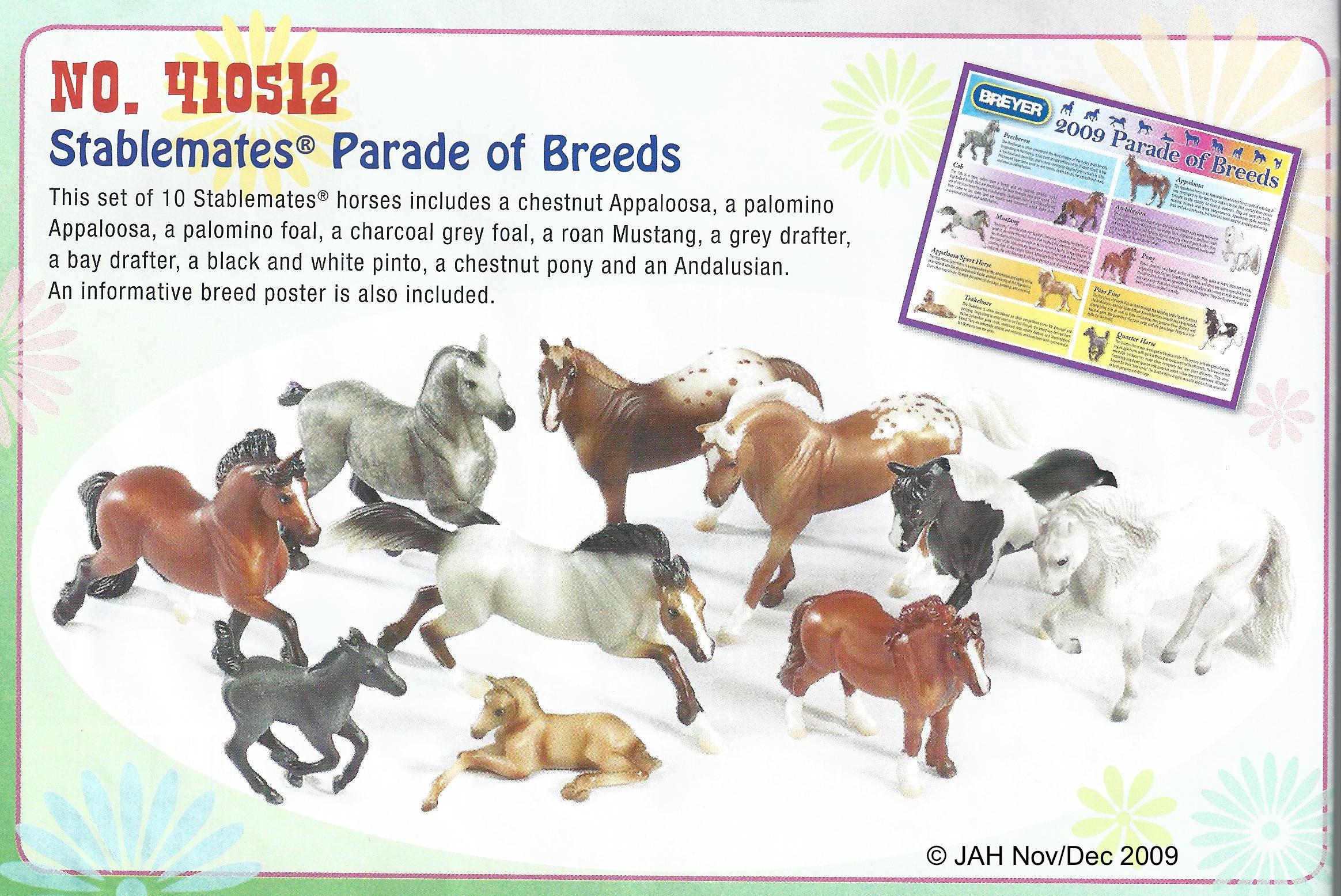 In 2009, this set was released through JC Penney as the 10 piece Parade of Breeds VI Set #410512 (JCP #671-1035) and included a poster of the models. The set included a light grey Andalusian, dapple grey Belgian, charcoal grey Cantering Foal, palomino appaloosa Cantering Warmblood, bay Friesian, chestnut Highland Pony, palomino Lying Foal, bay roan Mustang, black pinto Paso Fino and a chestnut appaloosa Standing Stock Horse.