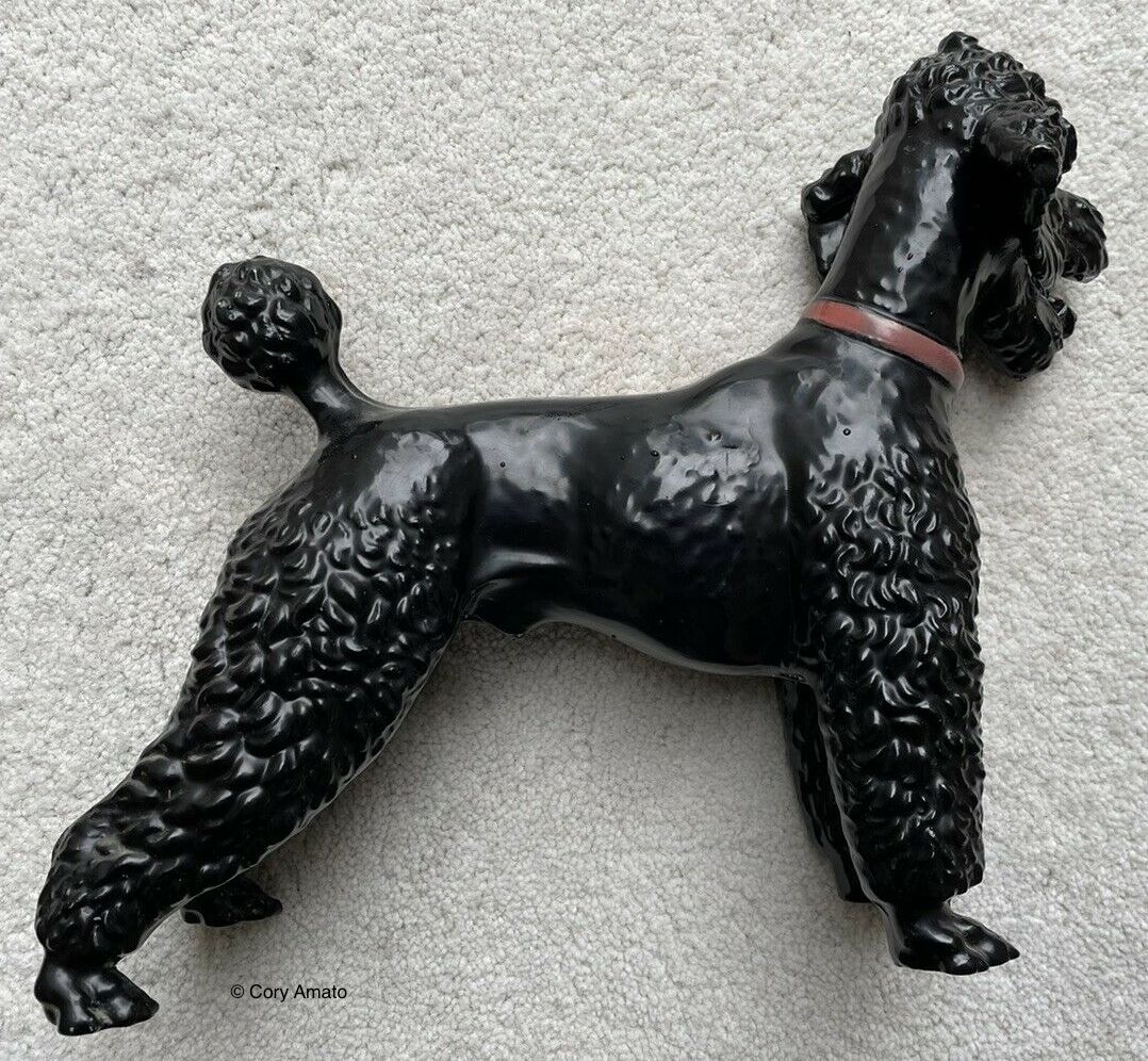 This model was copied from a Rosenthal china poodle. Early models had no mold stamps, then the round Breyer Molding Co Copyright Stamp was added around 1960. The ears are separately molded pieces.