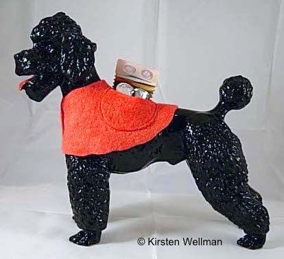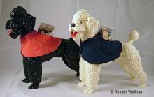 In 1957, The French Poodle and Perfume Set was sold through Spiegel and the Saucy French Poodles were sold through Montgomery Ward. Each Poodle was wearing a red or dark blue felt snap-on blanket that contained bottles of perfume.