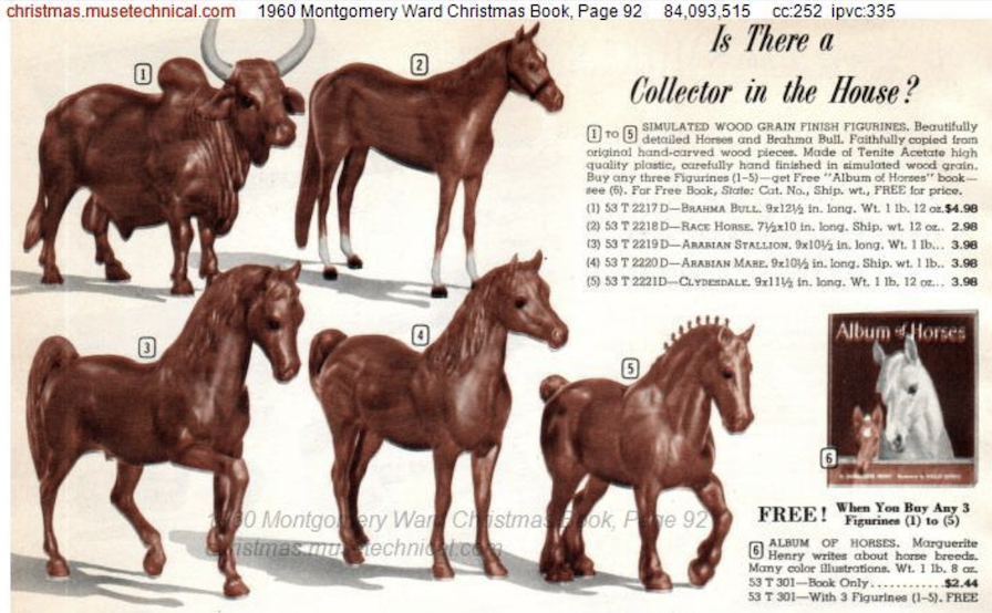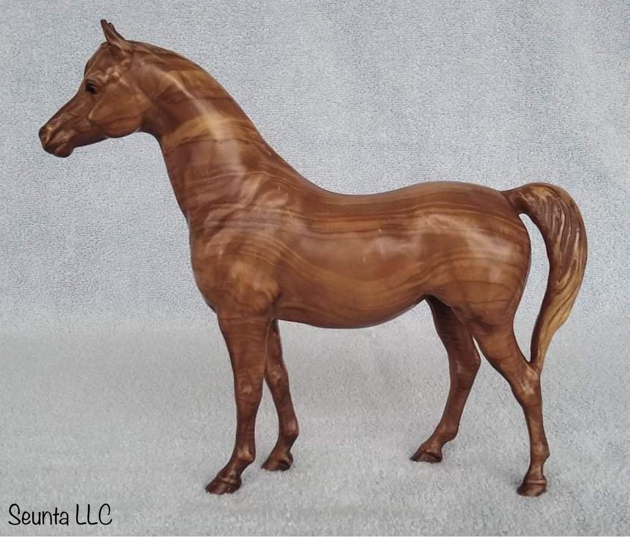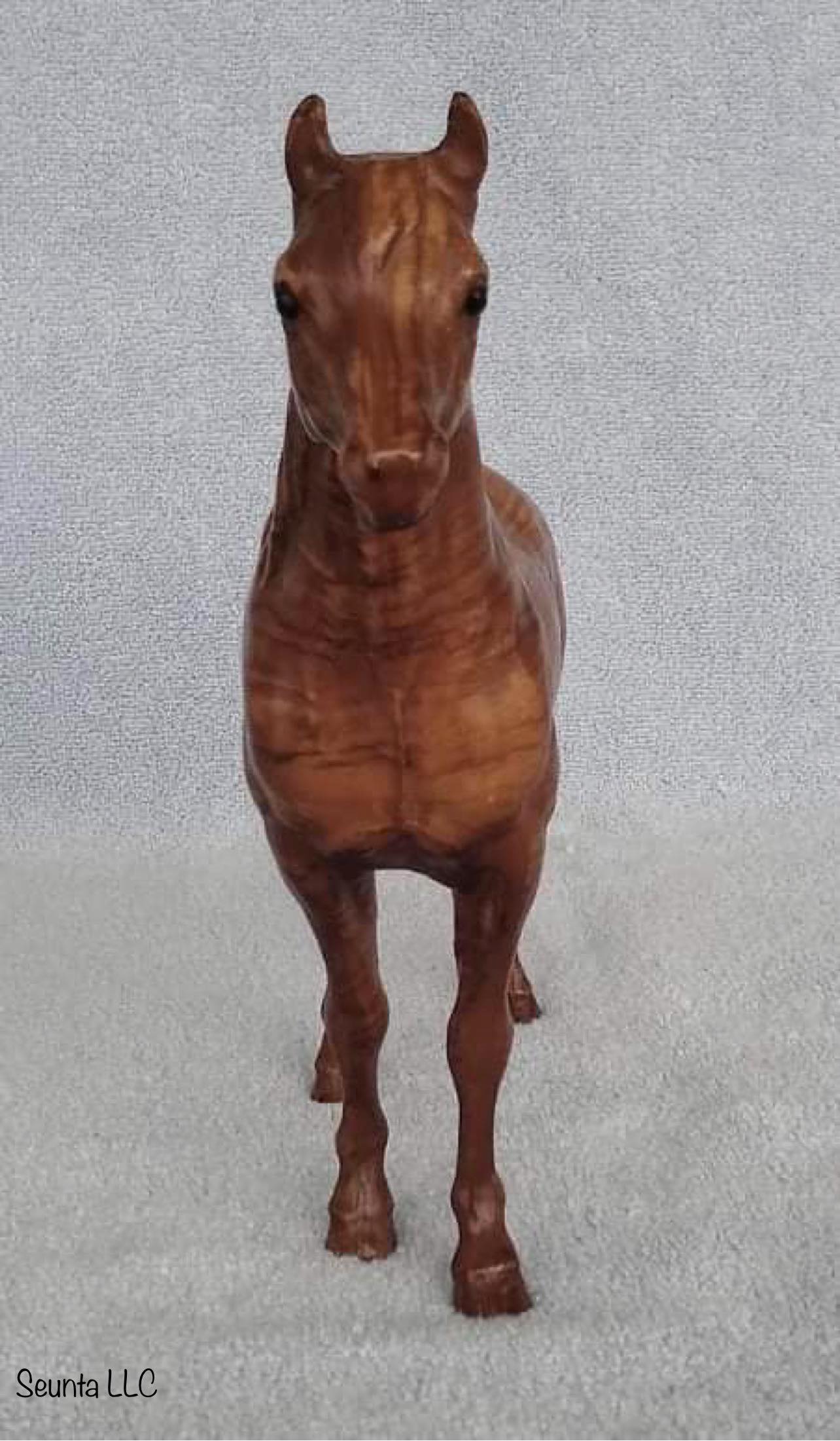 Woodgrain with no white markings and black eyes. This mare was pictured in the 1960 Montgomery Ward holiday catalog, however the Family Arabian Mare is pictured in the 1960 Dealer catalog. This model may have been an early version or release of the Family Arabian Mare released in 1960.
