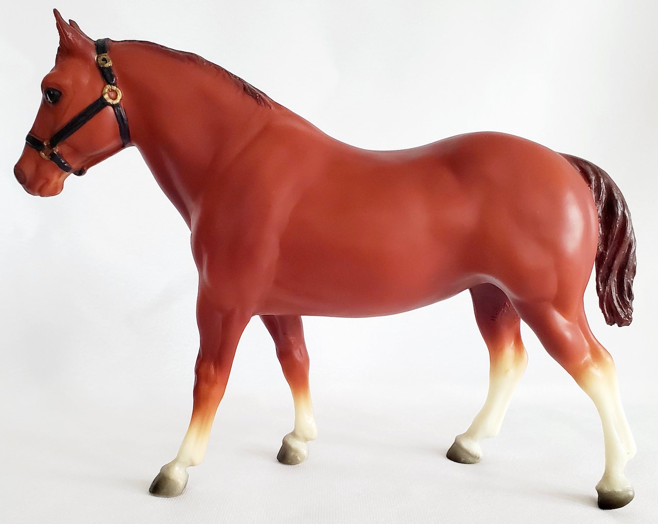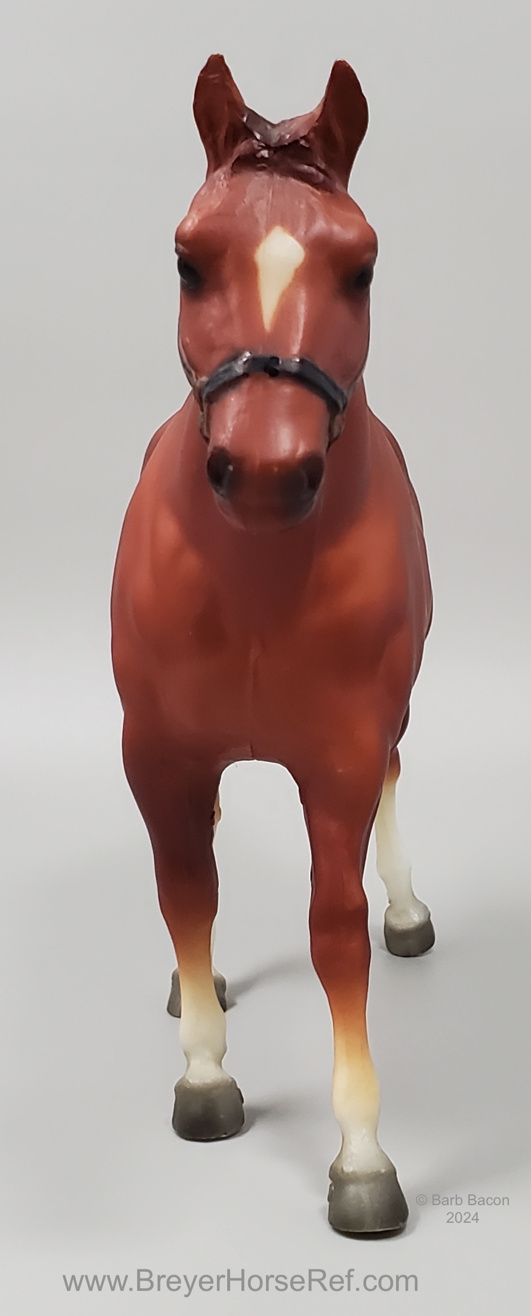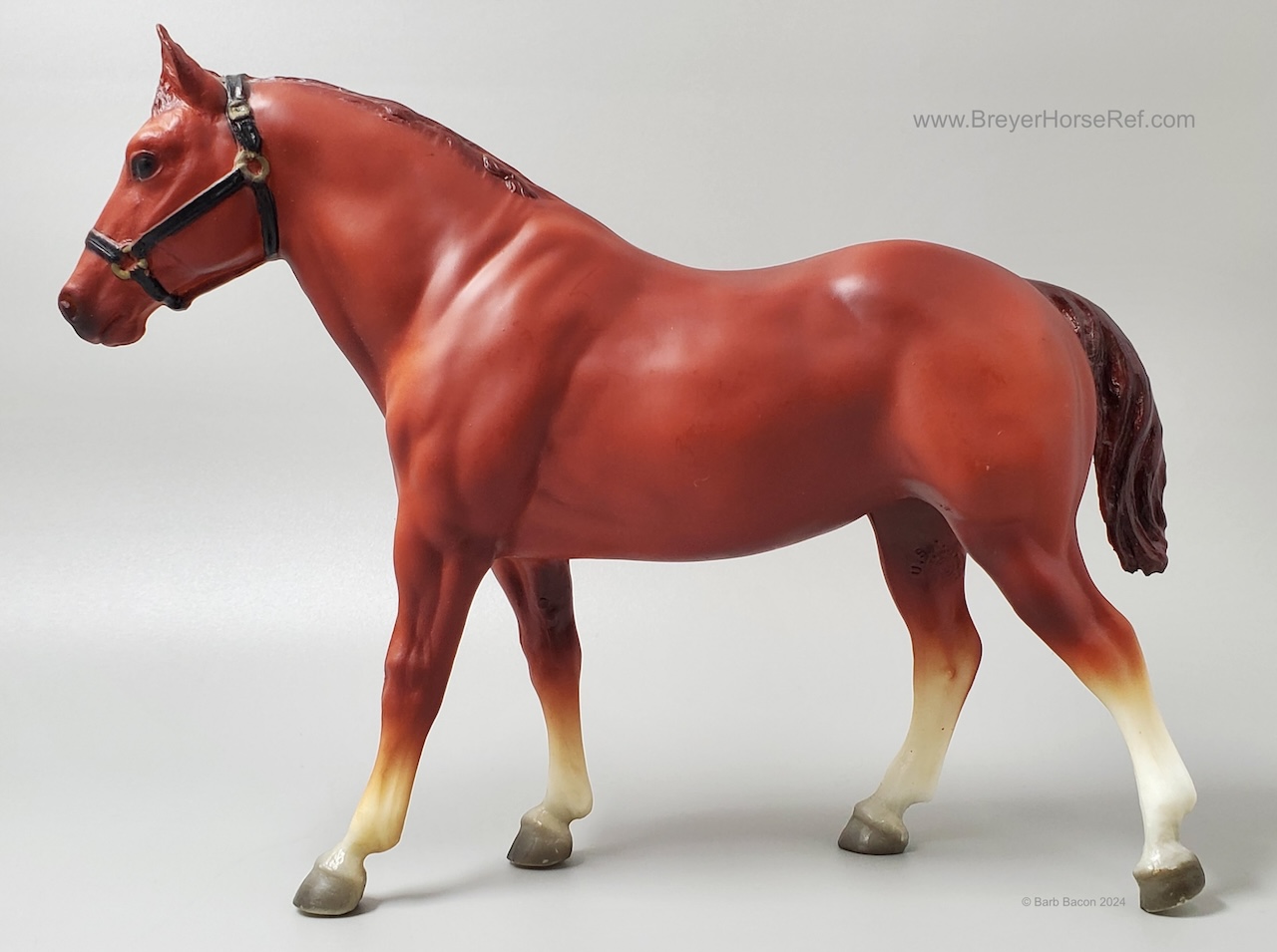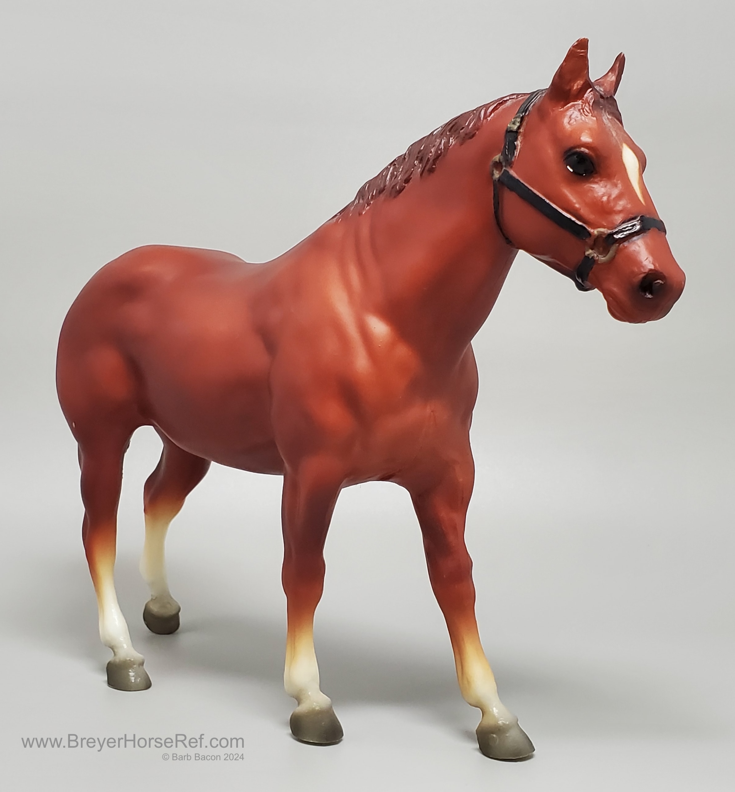Red chestnut with darker mane and tail, 4 stockings with grey hooves, long star and black halter. 1400 models made for Eighmey's Wagon Shop in IA; however, an estimated 700 of them were flocked and made into mules for their vehicles. An estimated 700 models were available in 1987 through other model horse retailers such as Bentley Sales, Horses International and Model Horse Collector' Supply.