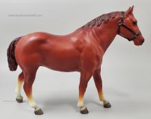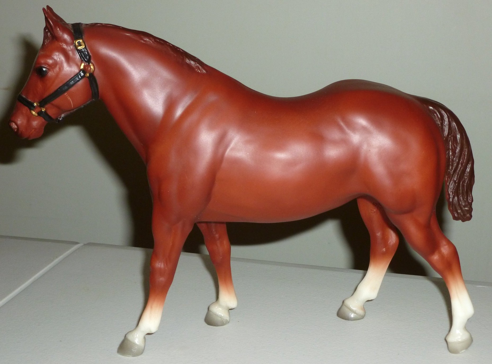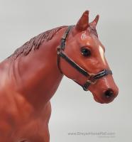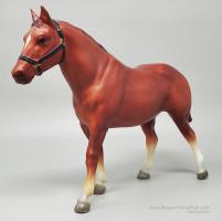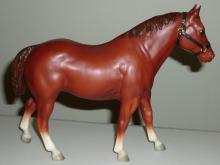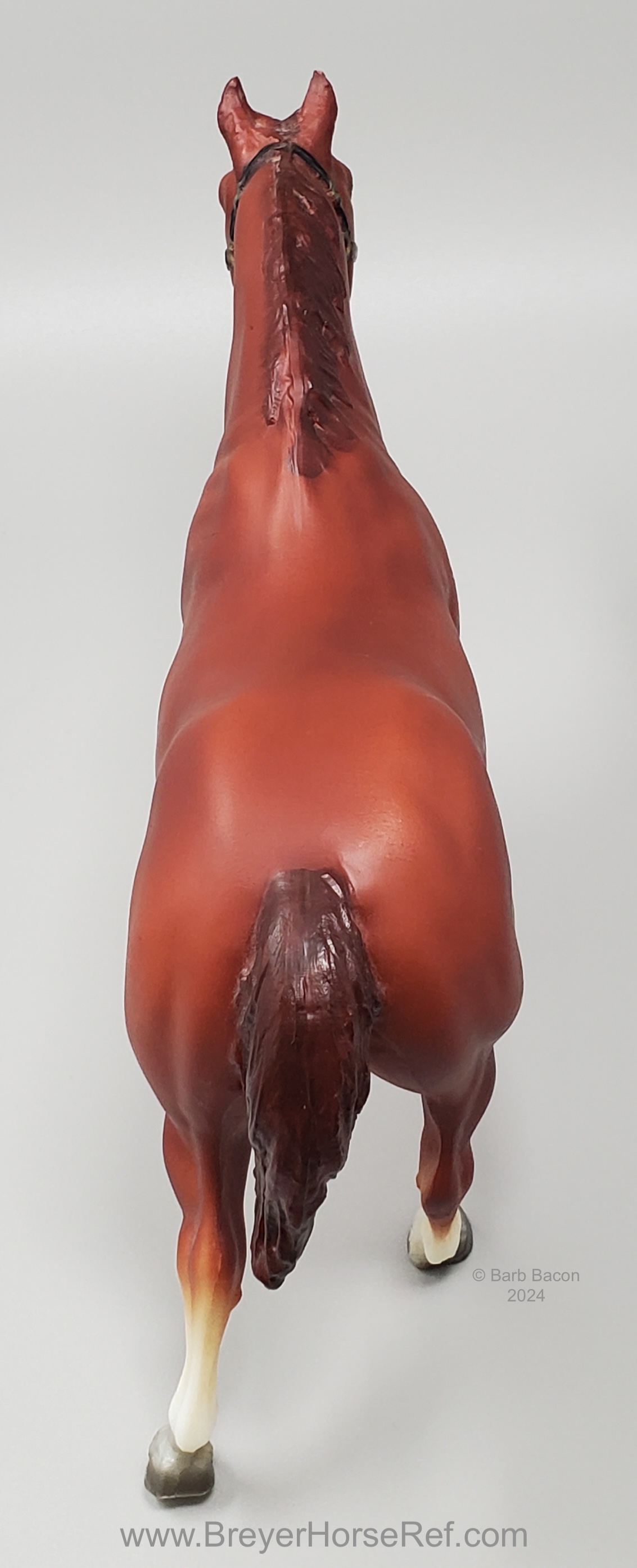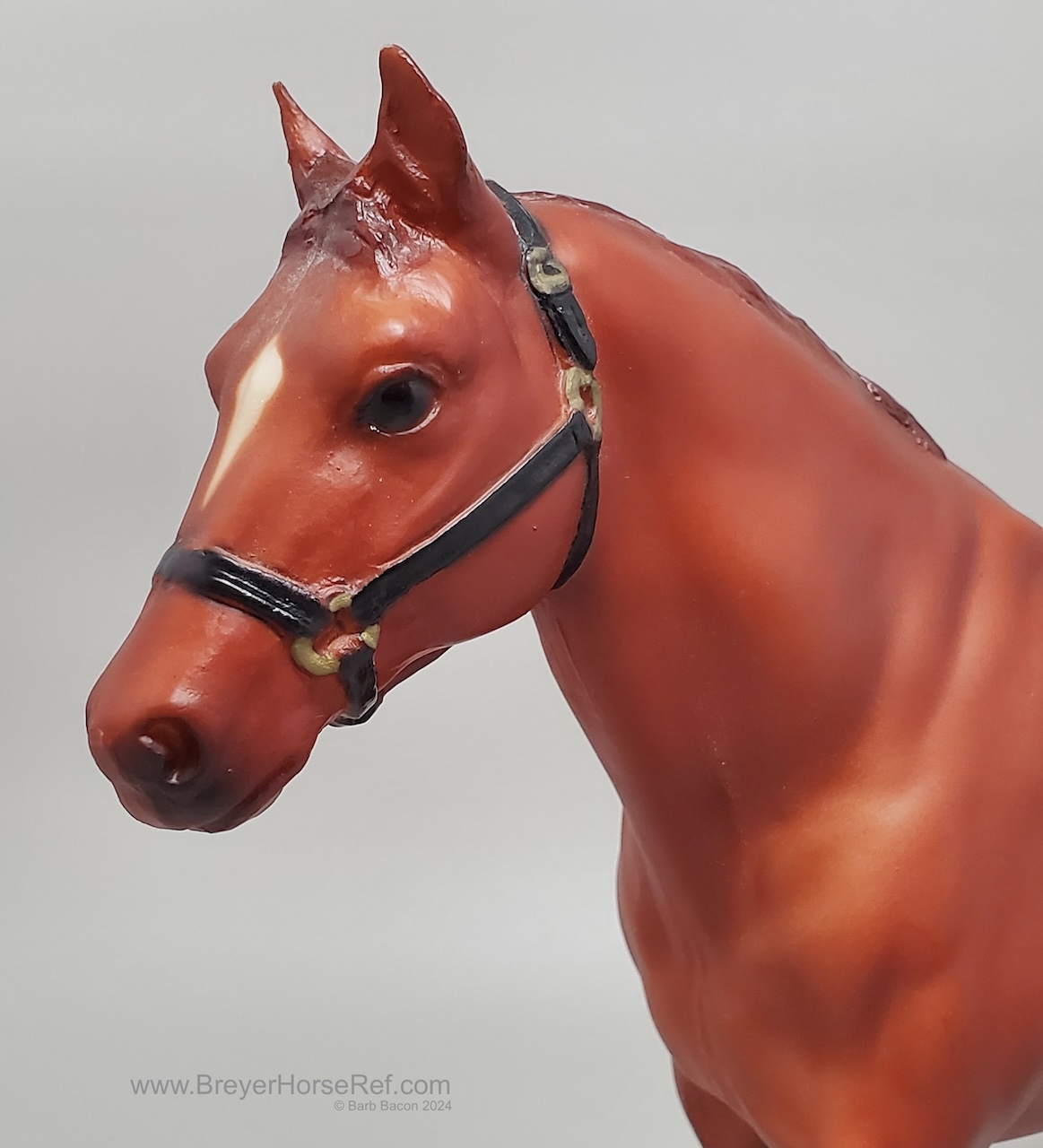Red chestnut with darker mane and tail, 4 stockings with grey hooves, long star and black halter. 1400 models made for Eighmey's Wagon Shop in IA; however, an estimated 700 of them were flocked and made into mules for their vehicles. An estimated 700 models were available in 1987 through other model horse retailers such as Bentley Sales, Horses International and Model Horse Collector' Supply.