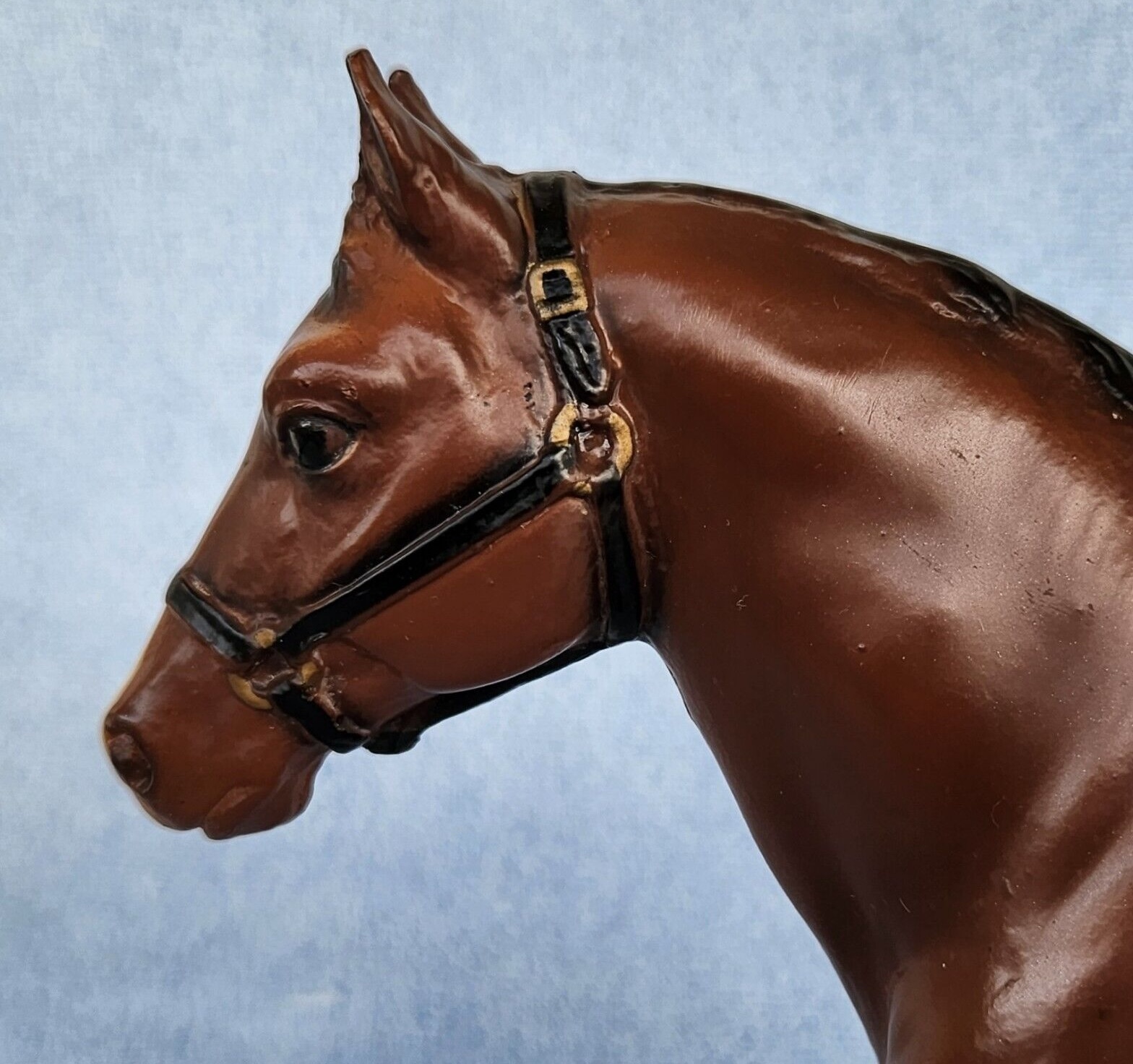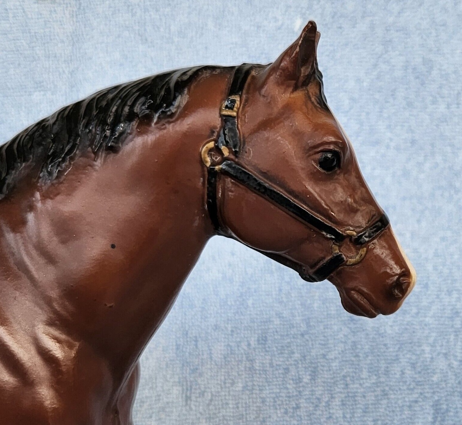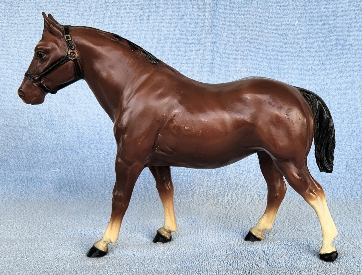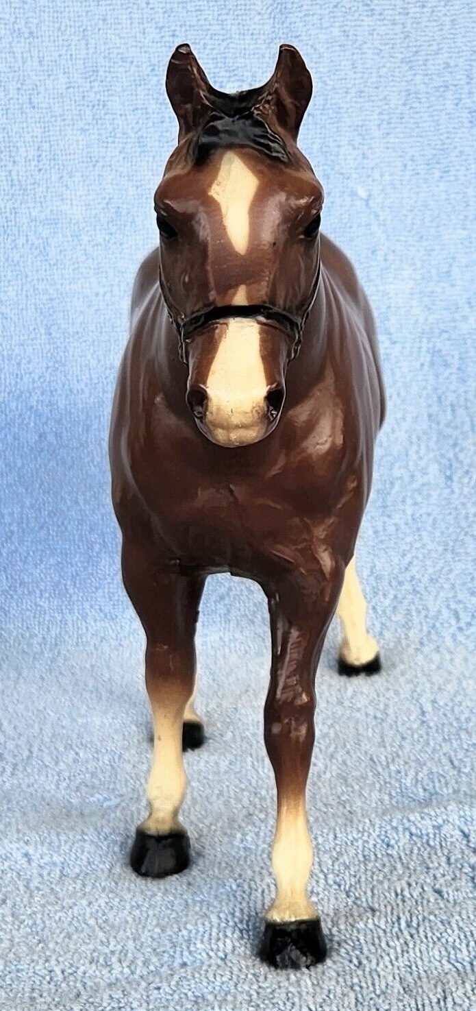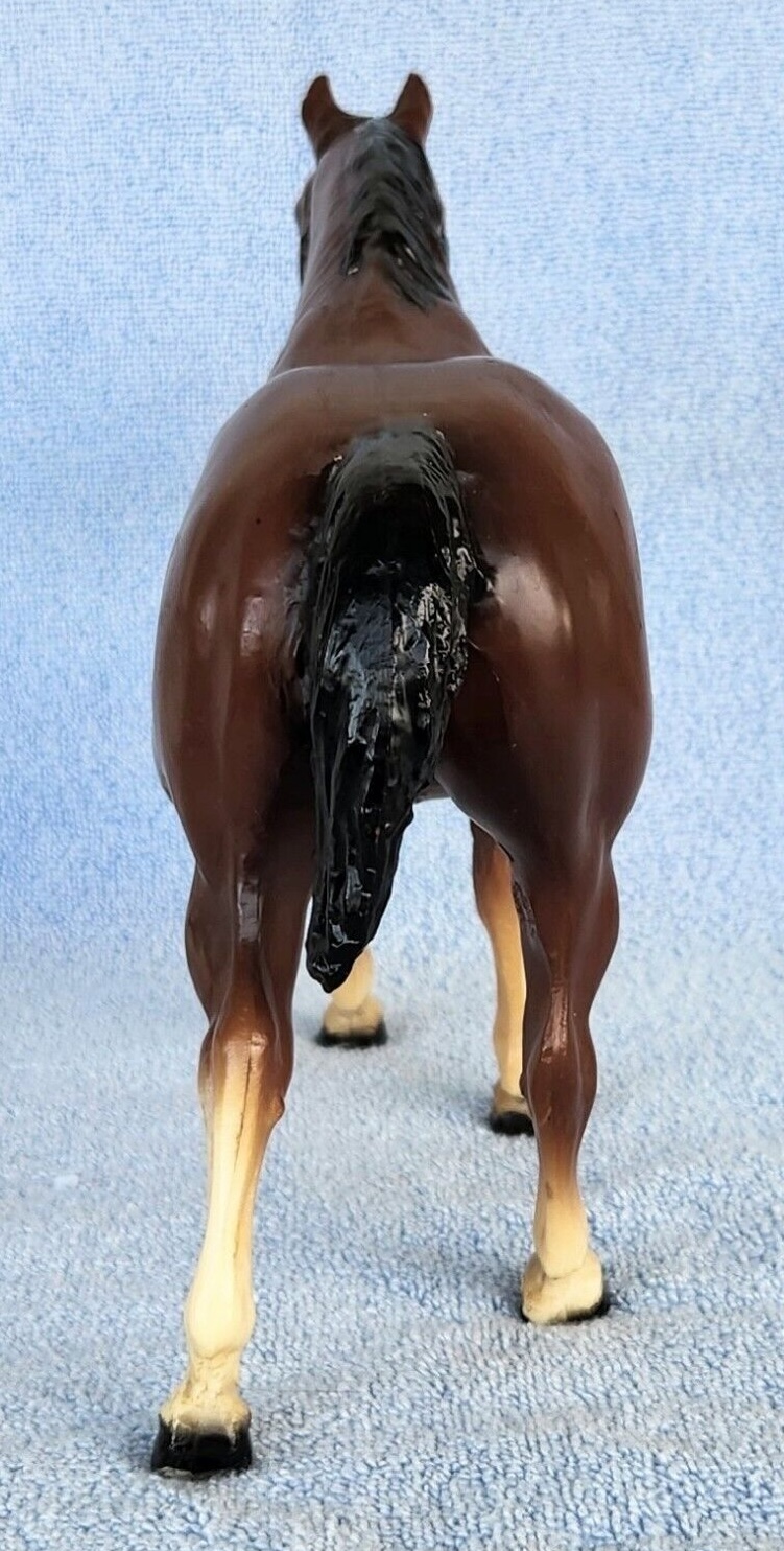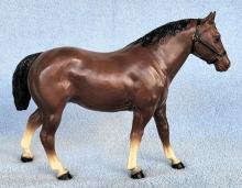 Bay with black mane and tail, no black on legs, 4 stockings with black hooves, broken blaze and black halter. This model is very similar to the #99 regular run, but is matte and does not have eye whites. 300 models made for Eighmey's Wagon Shop in IA; however, 250 of them were flocked and made into mules for their vehicles.