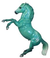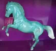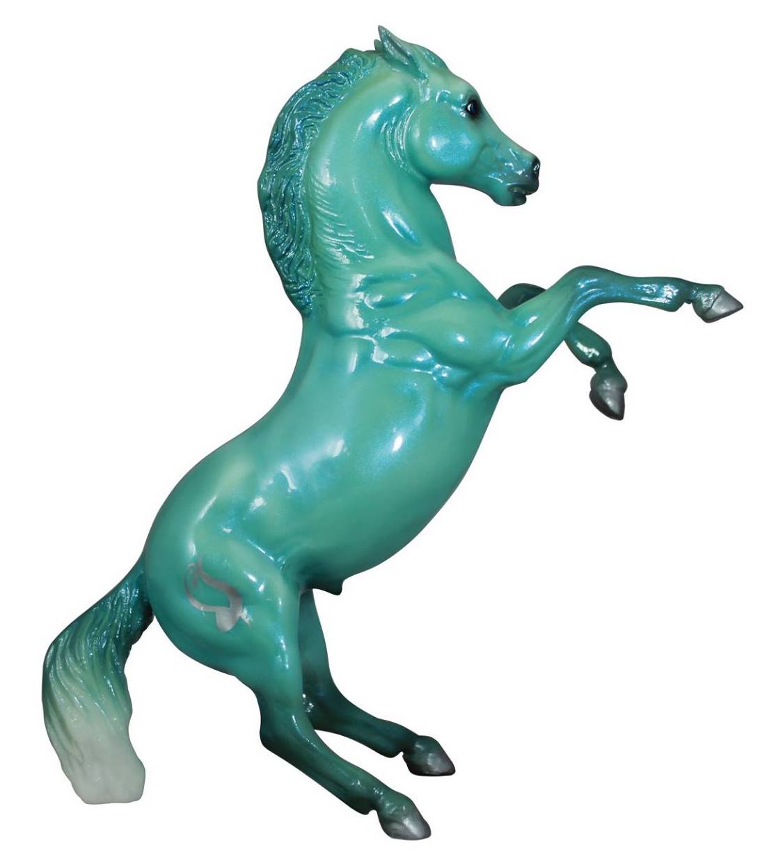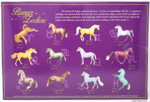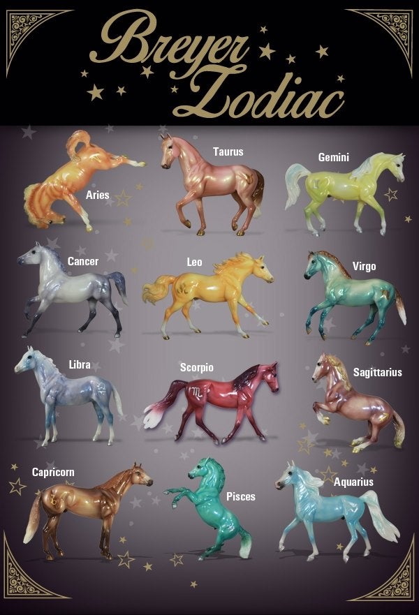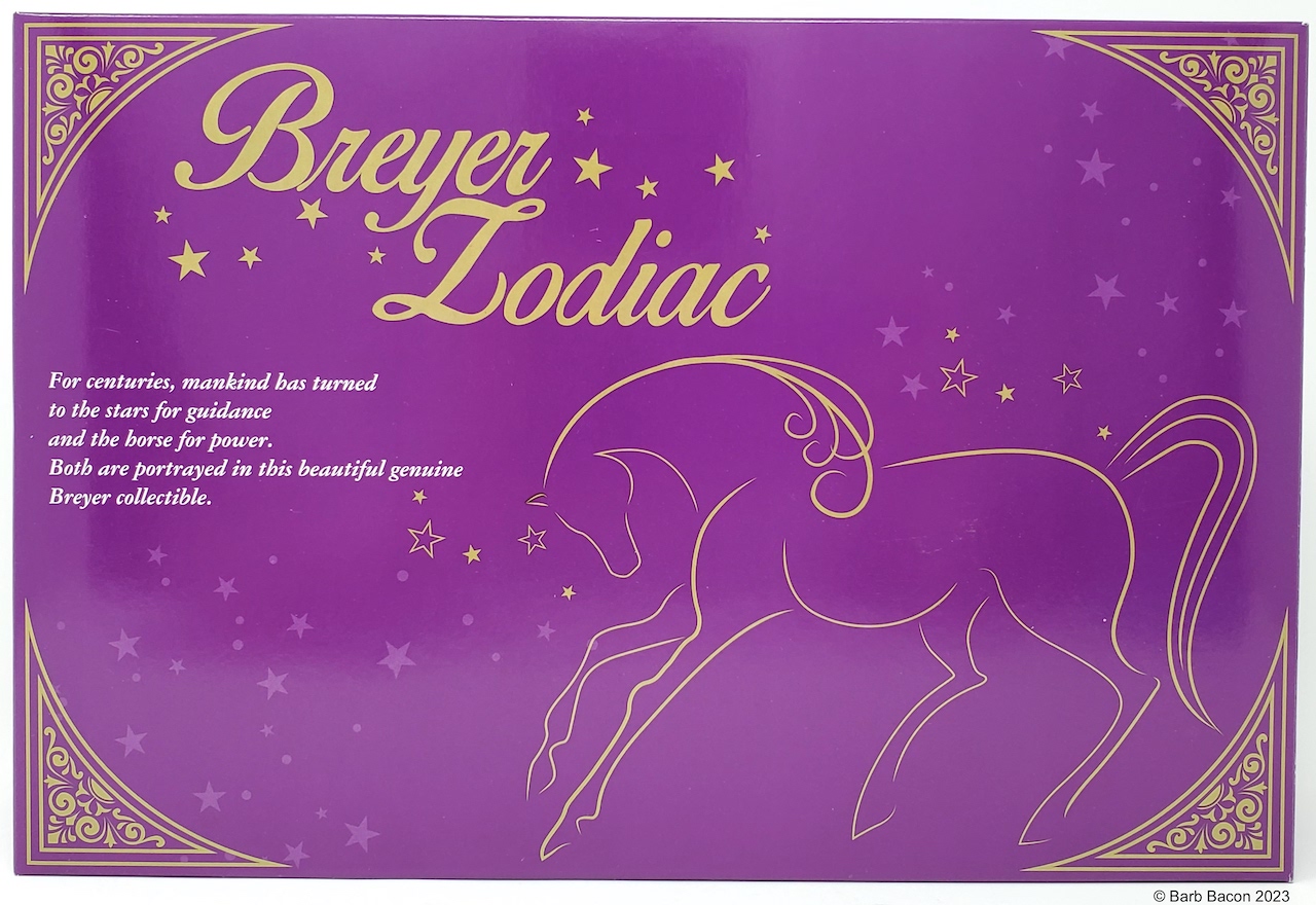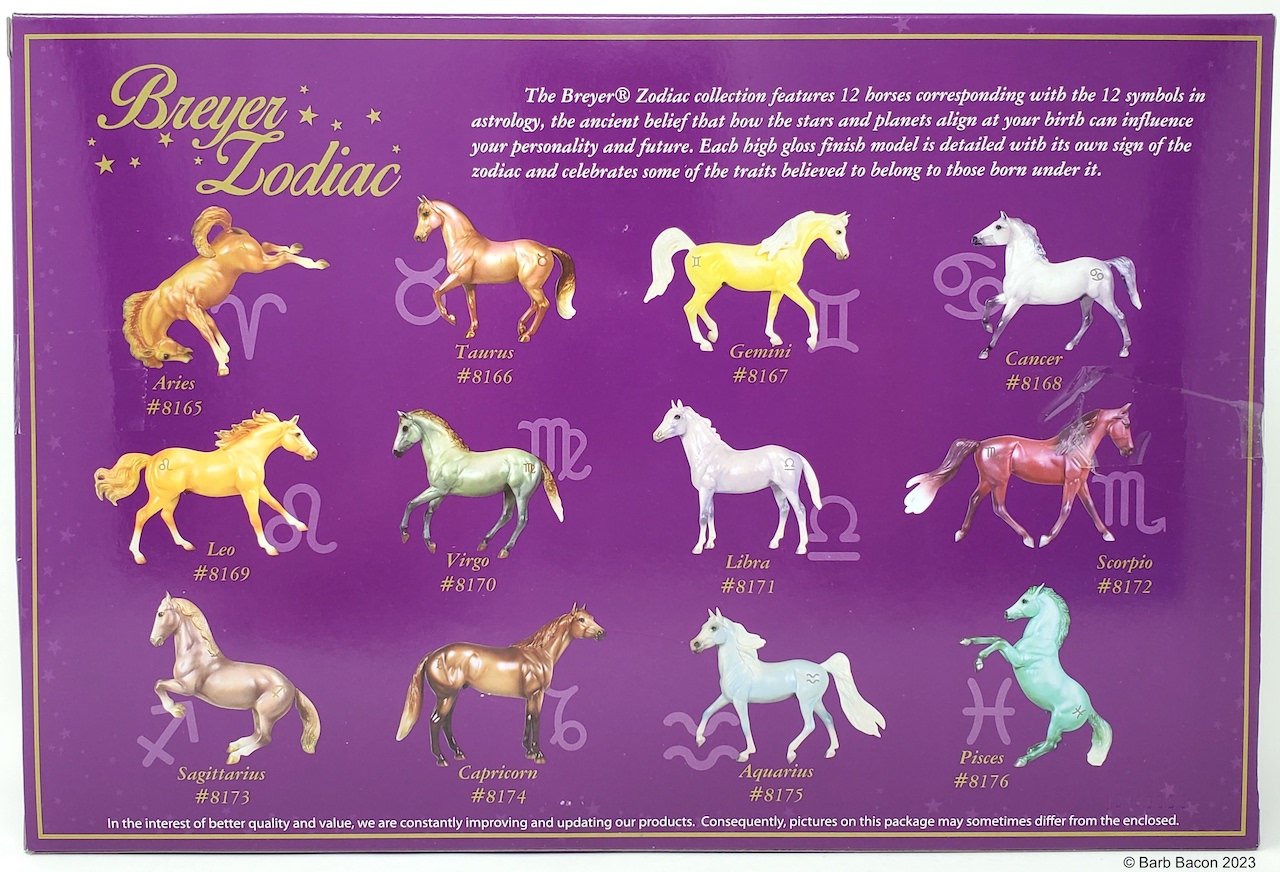 "In 2015, Breyer introduced the Zodiac Series: a collection of decorator models each inspired by the twelve signs of the Zodiac. Each of the twelve signs had their own unique design, but the models in the same Zodiac element also shared some common traits, such as dark legs with silver hooves on water signs and white socks with golden hooves on fire signs. Two symbols for the model's sign appeared on each side of their rump. Each model was finished with a thick layer of gloss to make their colors pop, and then packaged in a full-color gift box. Pisces: February 19-March 20." www.breyerhorses.com.