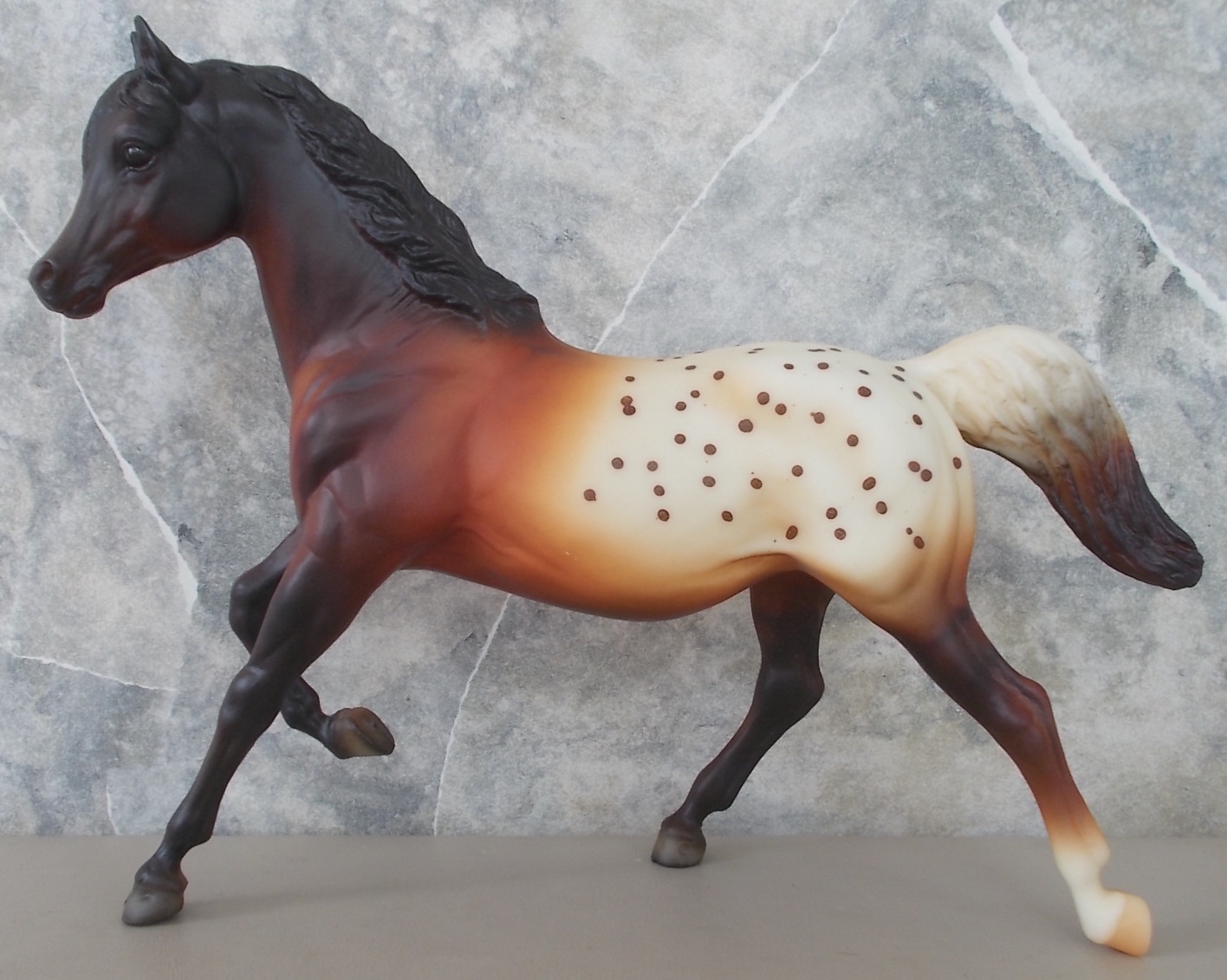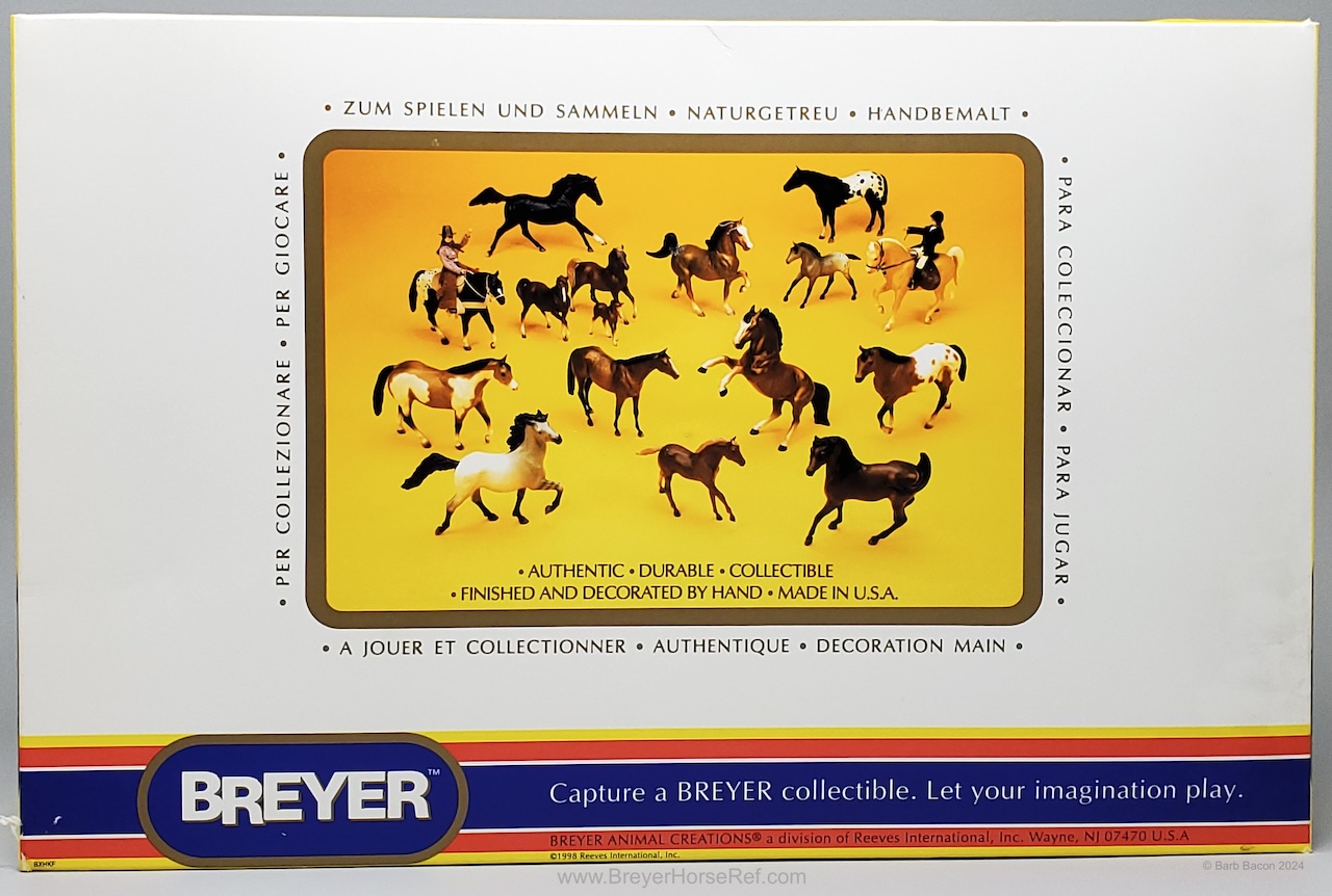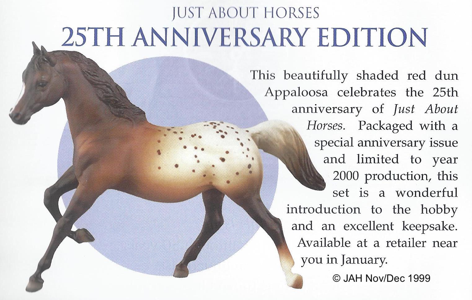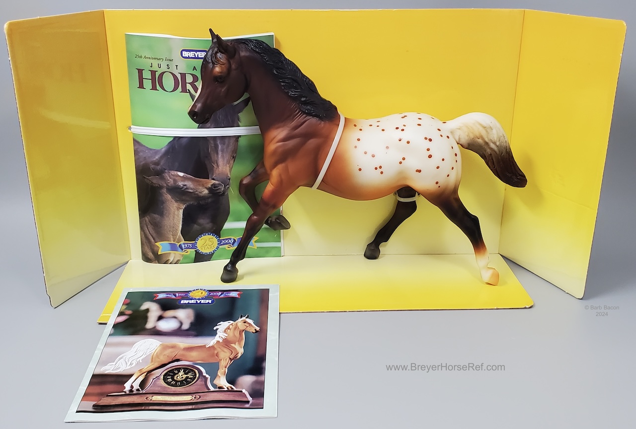 Advertised as a red dun appaloosa. Also available through Sears in 2000 along with the JAH issue. On the 2000 Retired List.