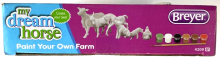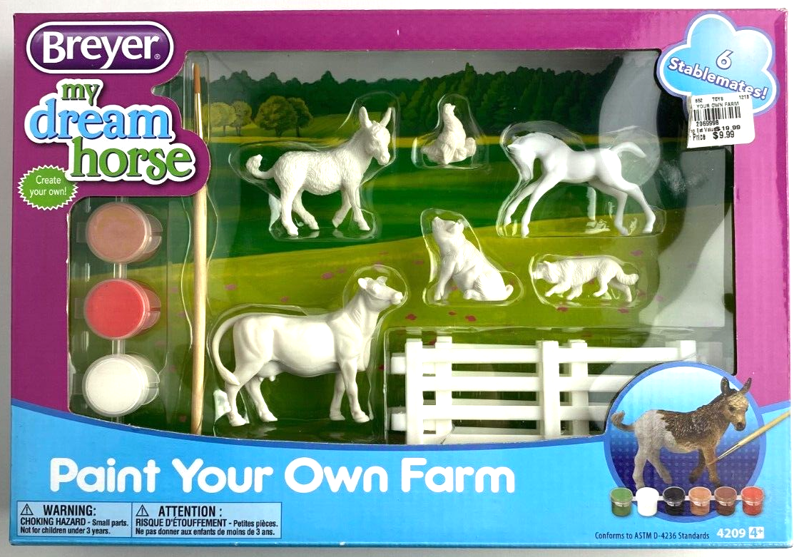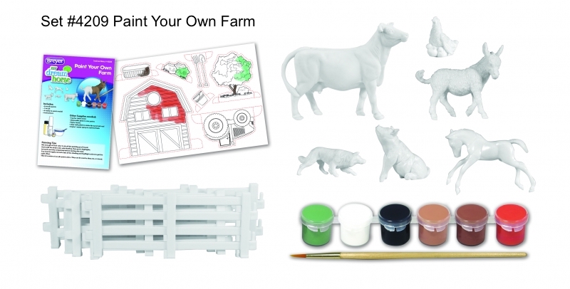 Released as the Paint Your Own Farm #4209 set from 2017-2018. Included a cow, scrambling foal, donkey, pig, chicken with chicks, border collie, 6 pieces of fence, 6 paint pots, paint brush and instruction booklet. On the 2018 Retired List, but still shown in the 2018/2019 catalog.