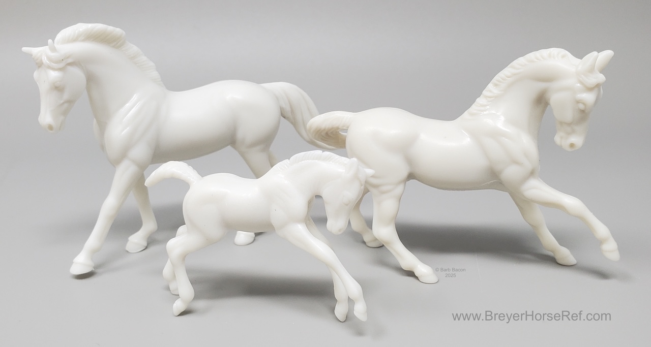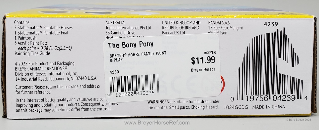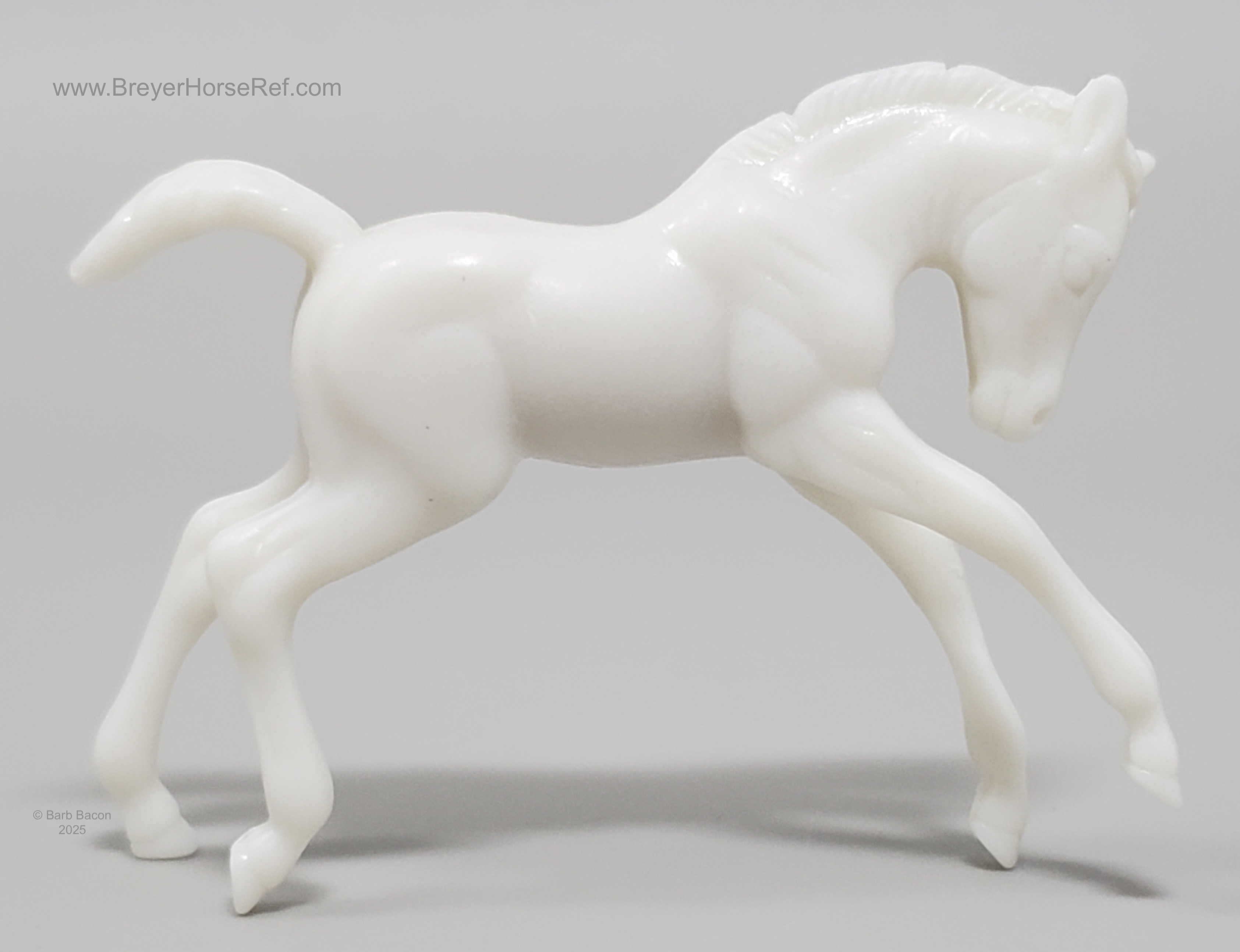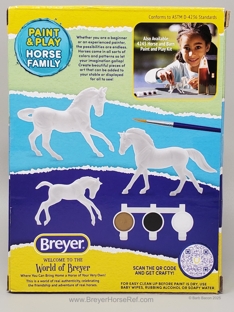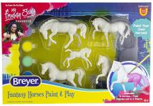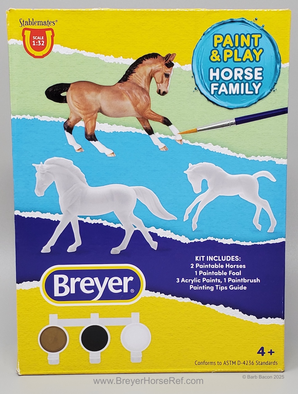 "Five horses, each base coated and ready to paint. Includes: 5 Stablemates horses, 6 fantasy color paint pots, and 1 paintbrush." www.breyerhorses.com. In a set with the Andalusian Stallion, Walking Arabian, Peruvian Paso, Rivet, and the Scrambling Foal. Fantasy Horse Paint Kit - Originally released as #4206, and later as #4235/W4235. Available 2017-2024. On the 2024 Retired List.