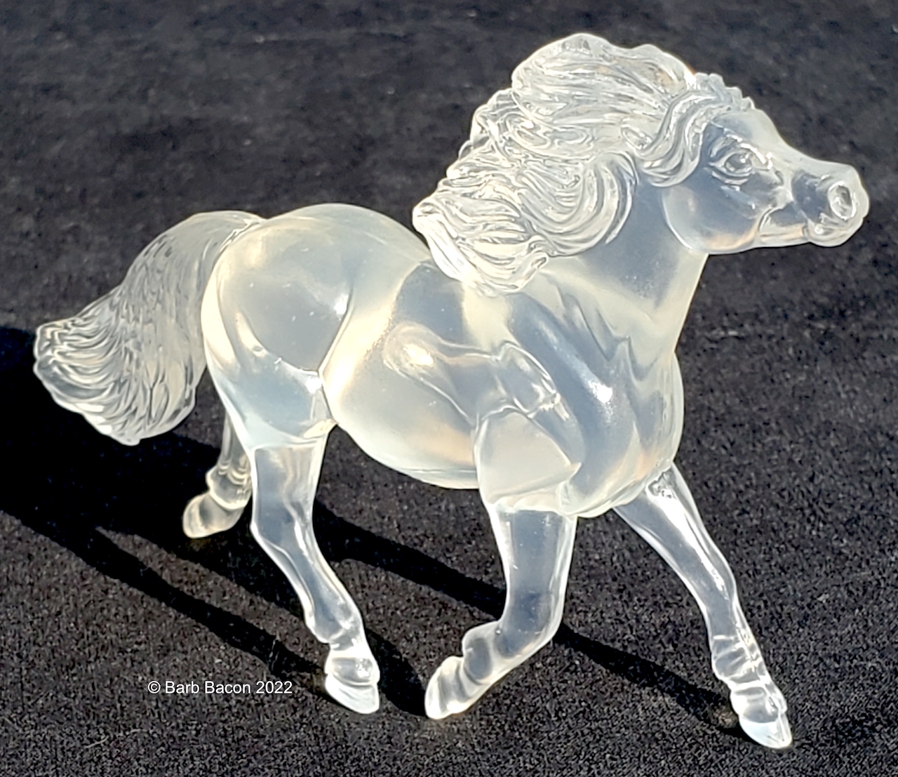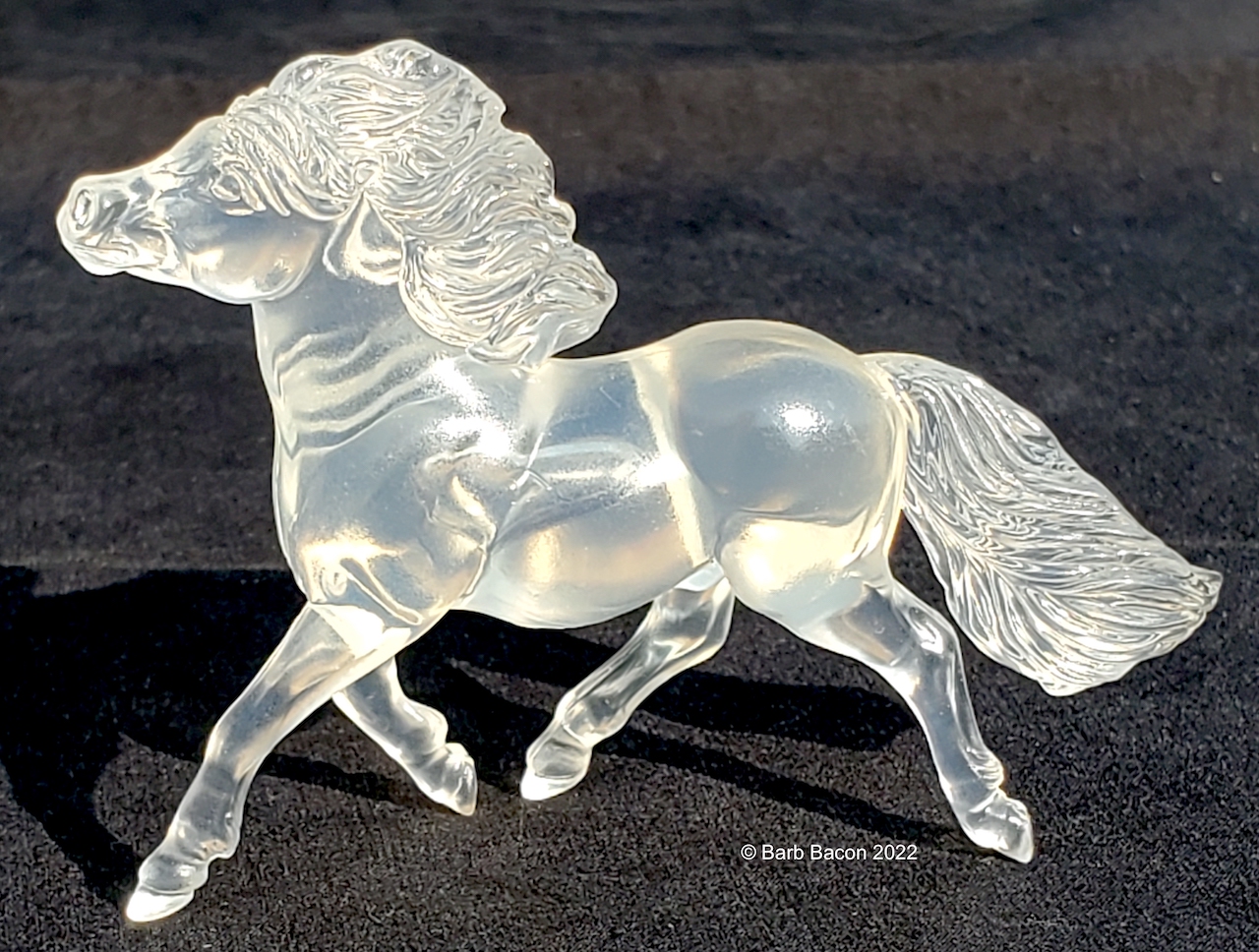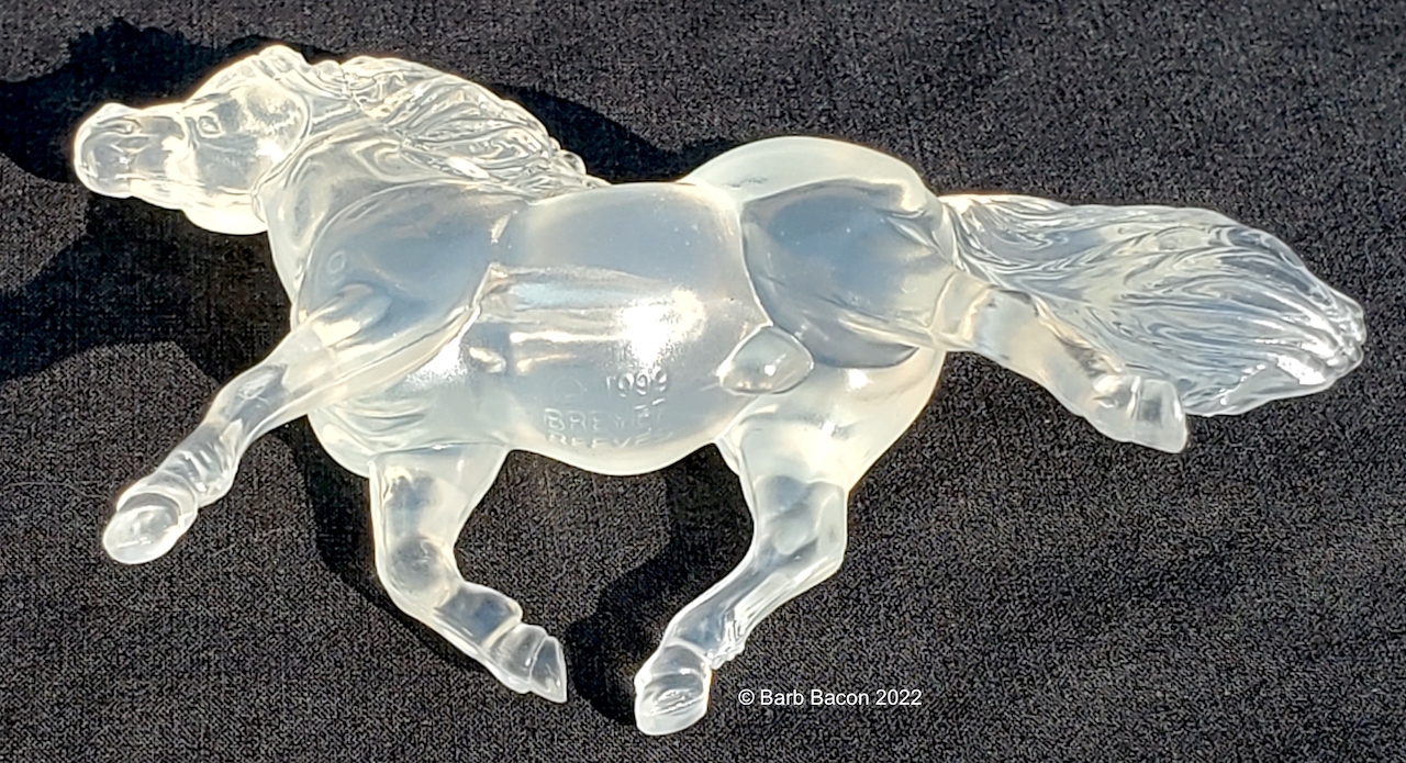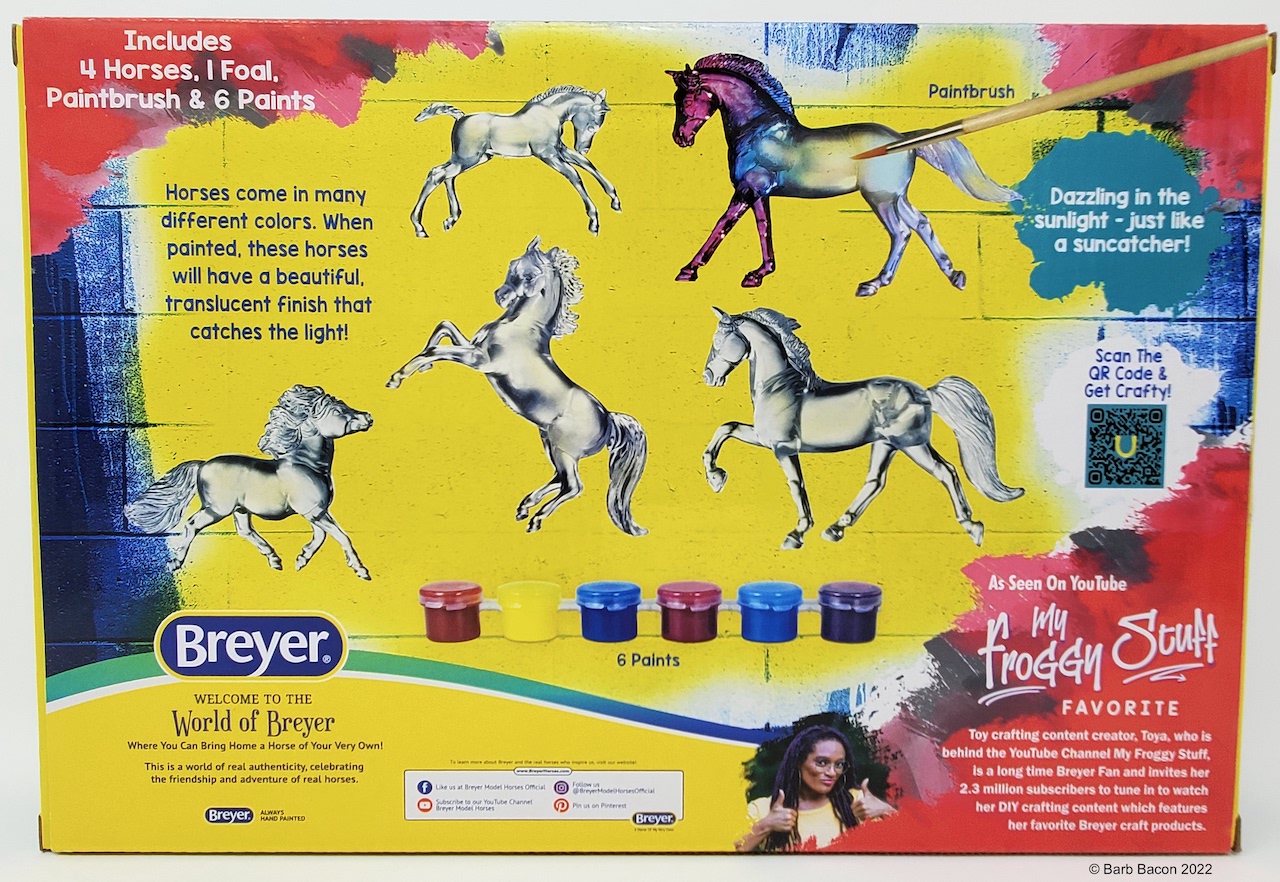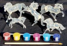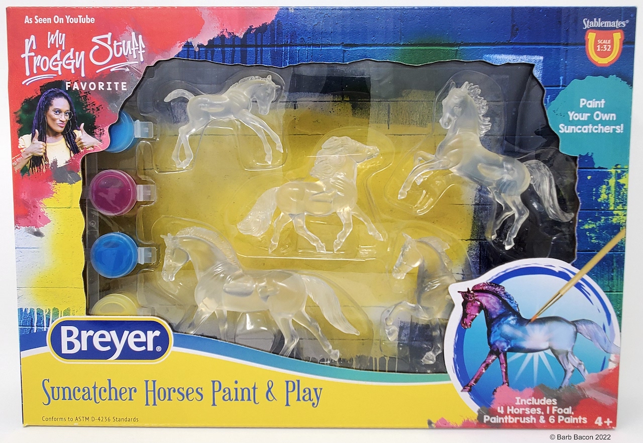 "This kit includes everything needed to create 5 beautiful Stablemates suncatchers. When painted with the special included paints, these horses will have a beautiful, translucent finish that catches the light. The set includes: 5 clear Stablemates models, 1 paintbrush, and 6 paint pots.” www.breyerhorses.com. Molds included the Cantering Warmblood, Rearing Arabian, Scrambling Foal, Shetland Pony, and TWH. Originally released as #4210, later released as #4237/W4237. From 2018-2026.