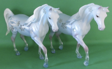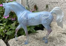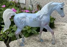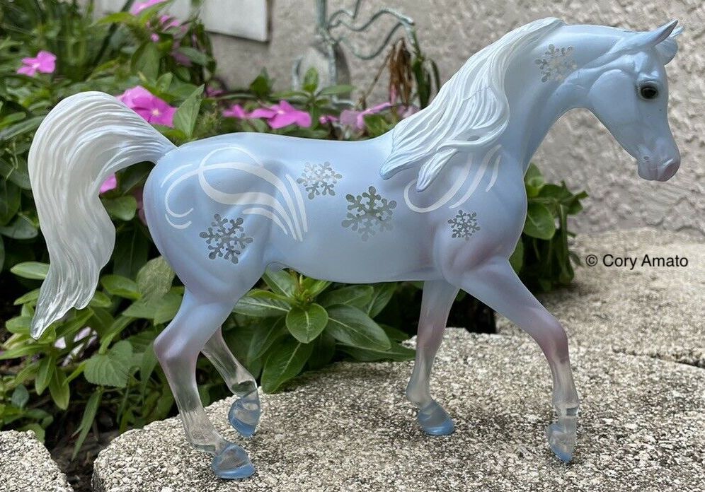 "Created with special clearware translucent plastic that gives him the appearance of an ice sculpture, Christoff conjures images of an icy winter with the swirling winds and delicate snowflakes that decorate his frosty blue coat." www.breyerhorses.com.
