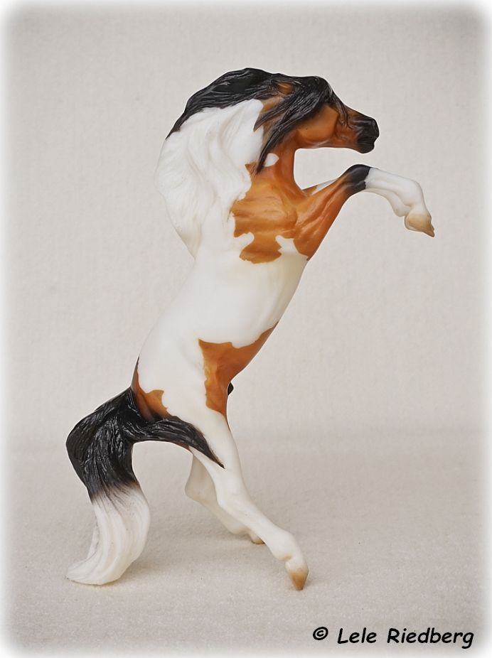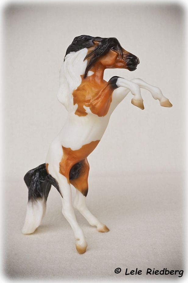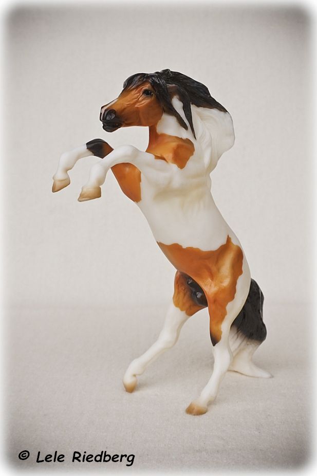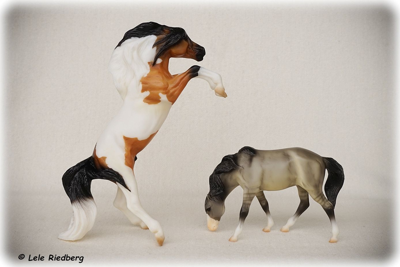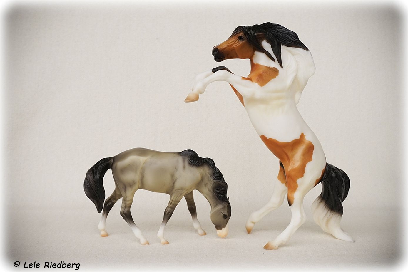 This set included Hongvi (a buckskin pinto Sombra) and Hinto (grulla Rojo). The series is #750199 and this particular set is #750208. Released 2008-2009. (Possibly again in 2014?). On the front of the box this set is labeled "Buckskin Pinto Rearing Stallion and Grullo Foal", and on the back is an incorrect description of a Chestnut Pinto Mustang and Grey Foal.